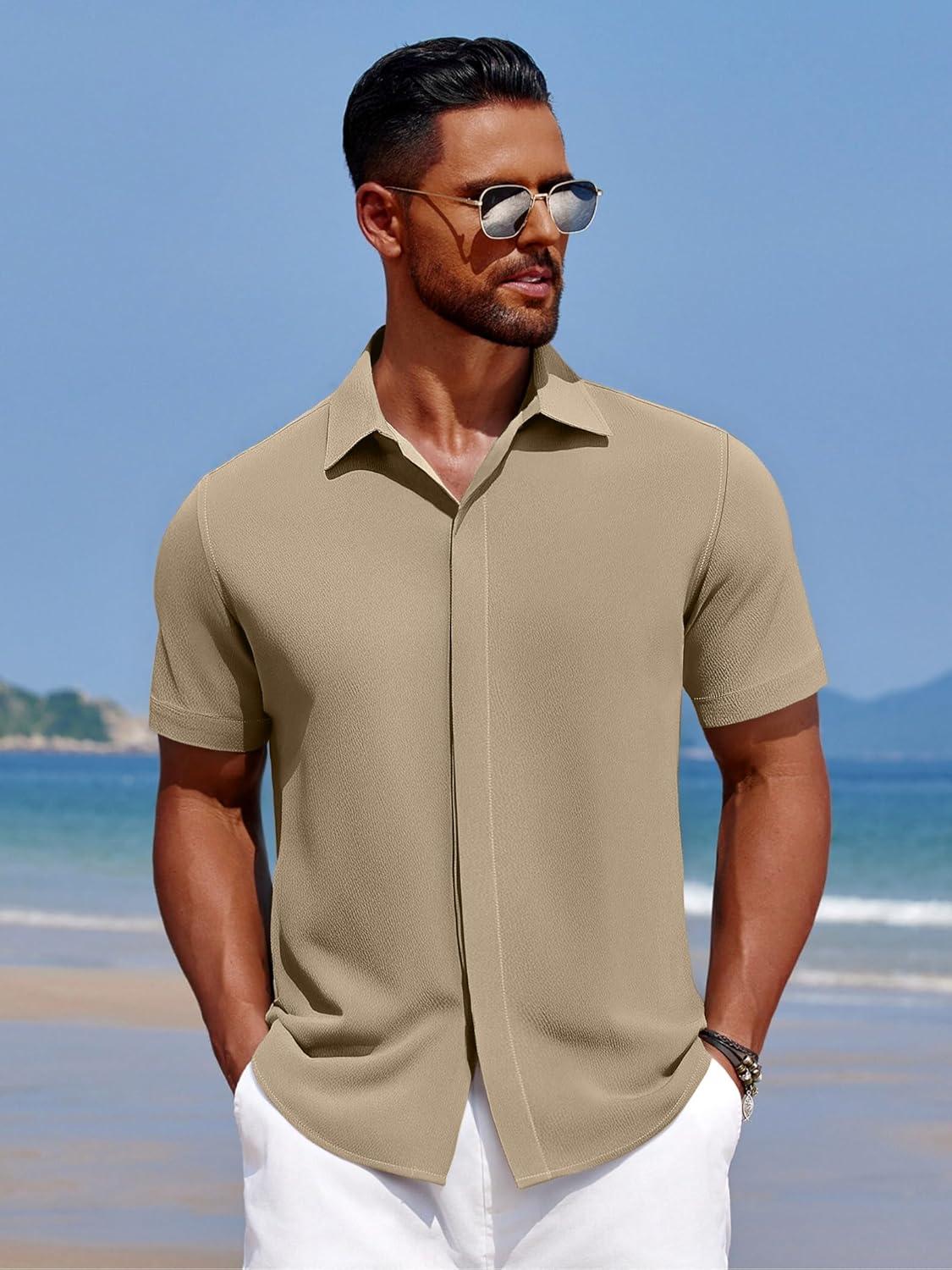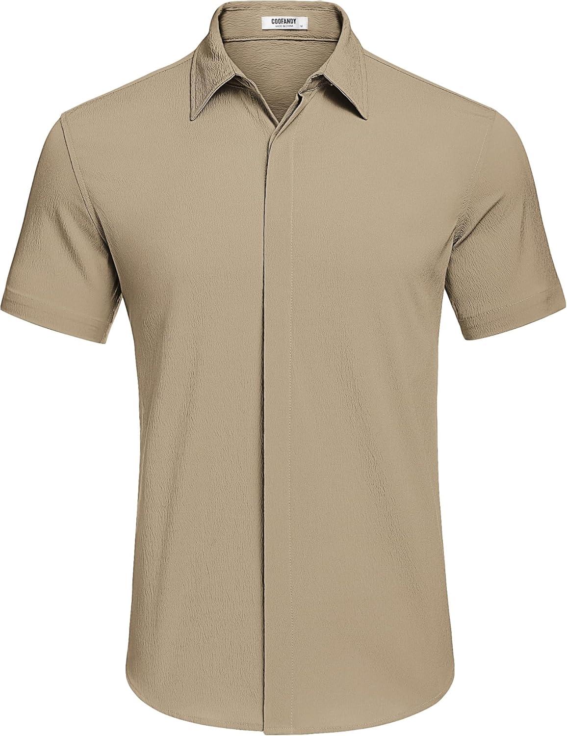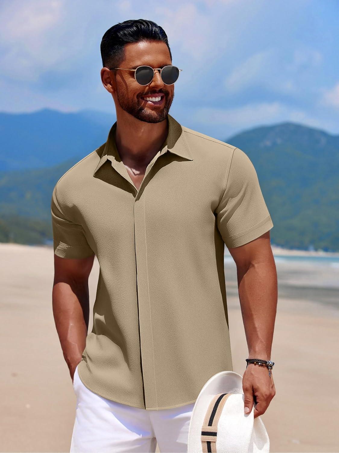 COOFANDY Men’s Casual Short Sleeve Button Down Summer Beach Shirt Lightweight Textured Wrinkle Free Stretch Shirts(Sesame)