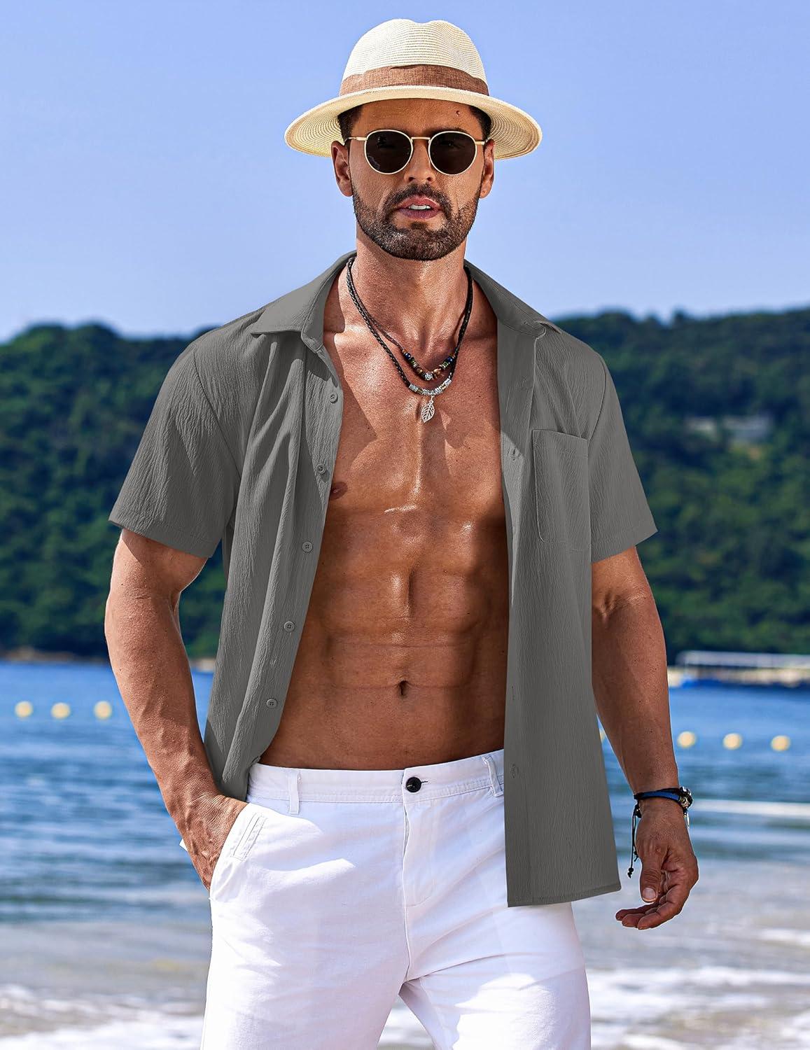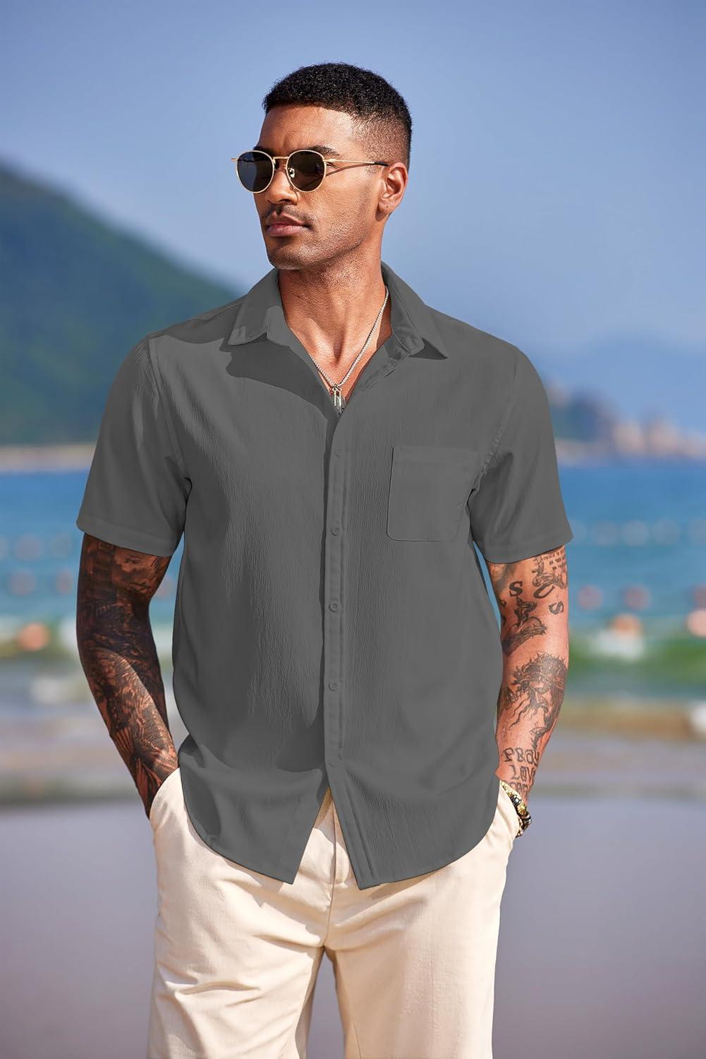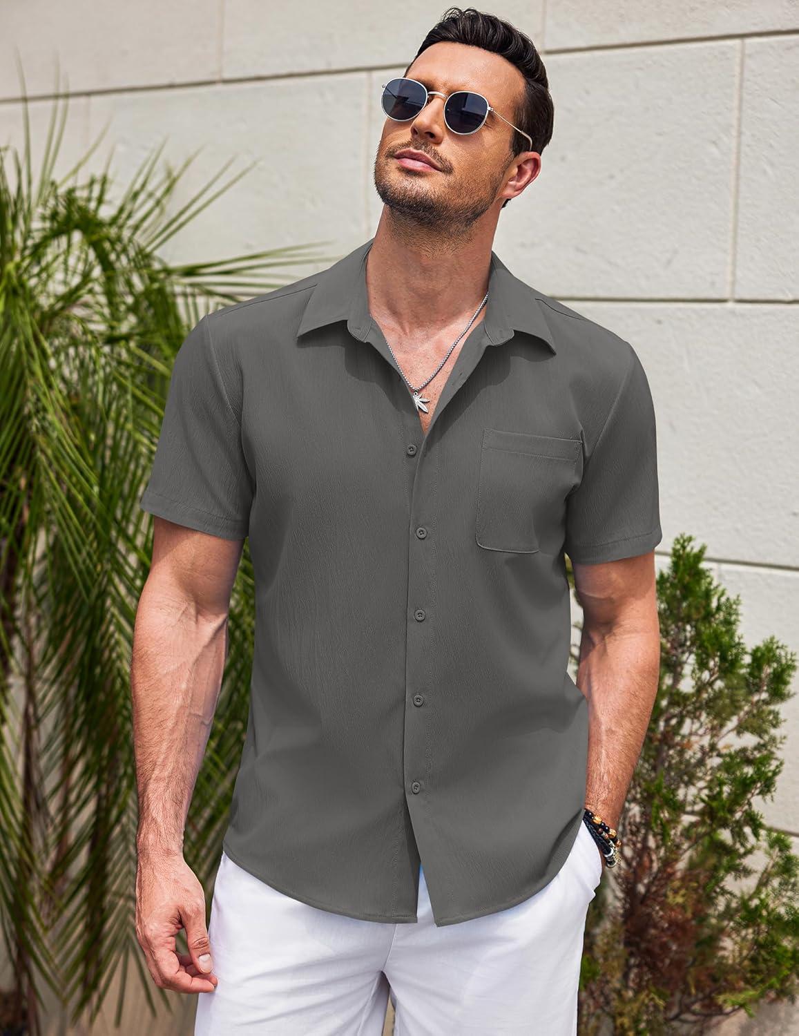 COOFANDY Men's Casual Short Sleeve Button Down Summer Beach Shirt Lightweight Textured Wrinkle Free Untucked Shirts(Granite Gray)