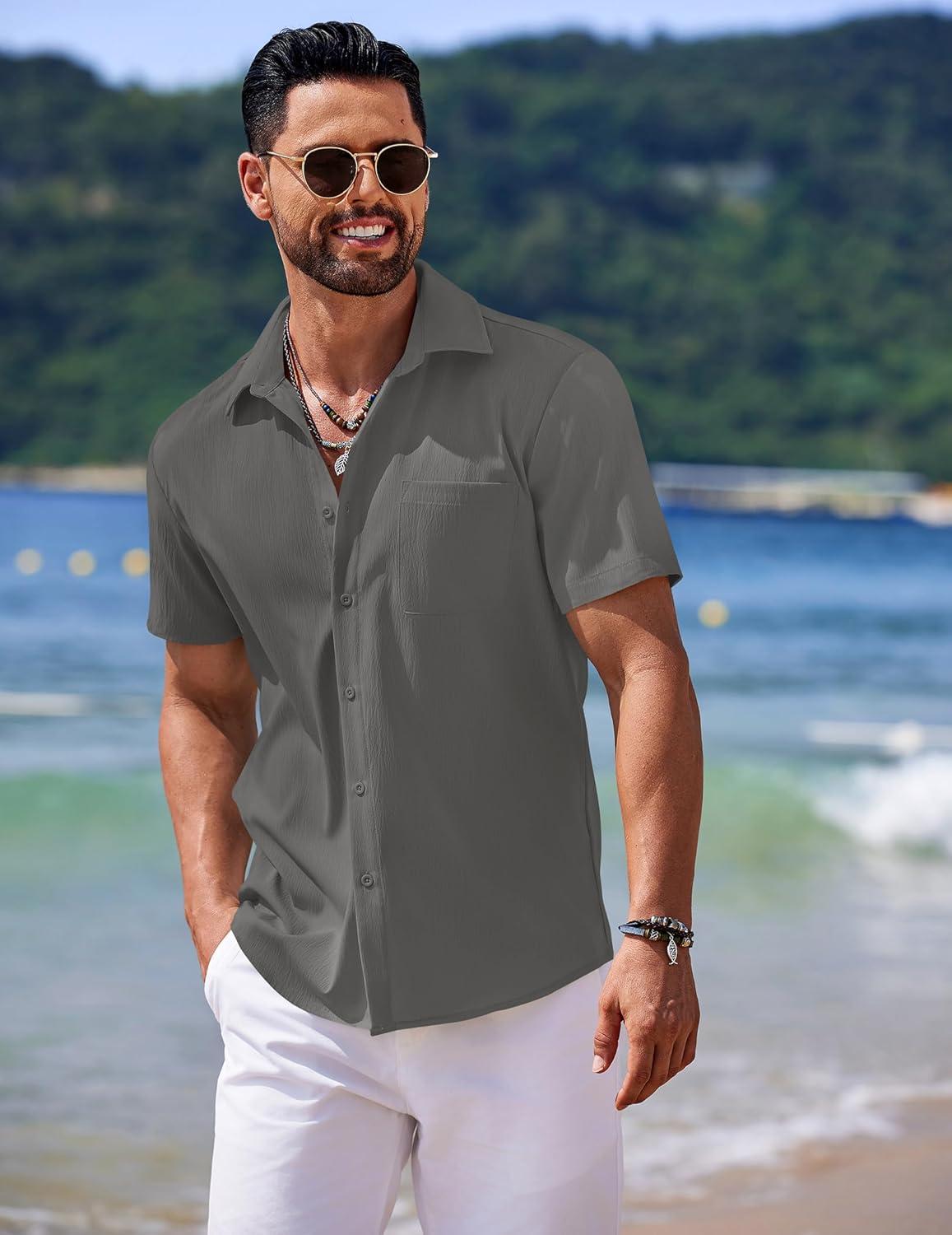 COOFANDY Men’s Casual Short Sleeve Button Down Summer Beach Shirt Lightweight Textured Wrinkle Free Untucked Shirts(Granite Gray)