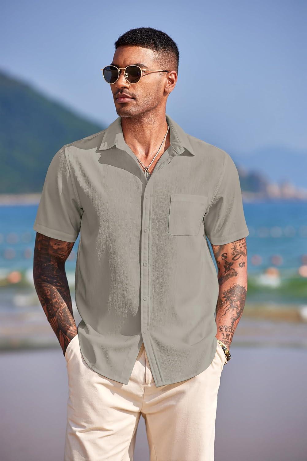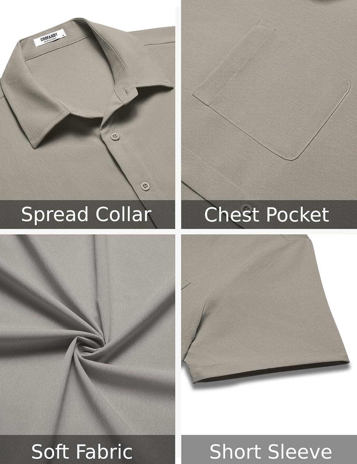 COOFANDY Men's Casual Short Sleeve Button Down Summer Beach Shirt Lightweight Textured Wrinkle Free Untucked Shirts(Quiet Gray)