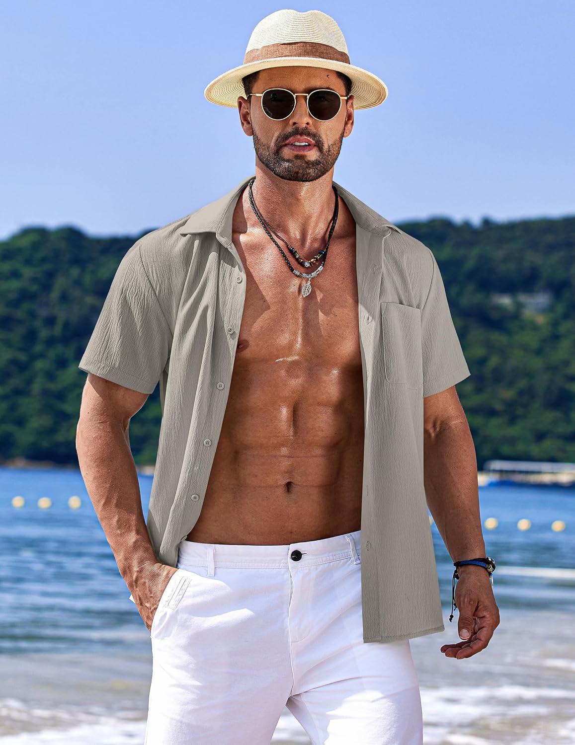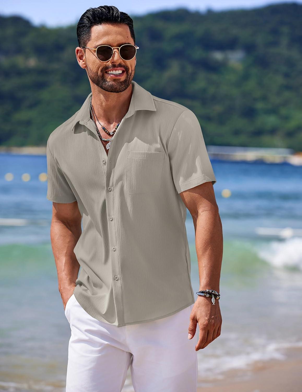 COOFANDY Men’s Casual Short Sleeve Button Down Summer Beach Shirt Lightweight Textured Wrinkle Free Untucked Shirts(Quiet Gray)