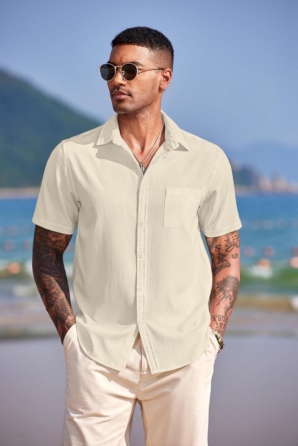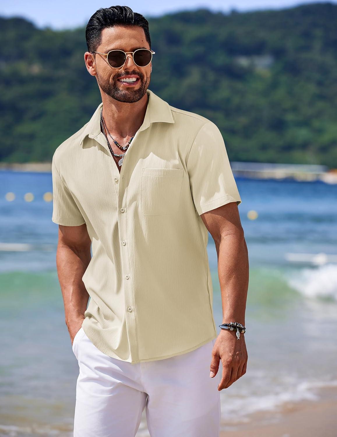 COOFANDY Men’s Casual Short Sleeve Button Down Summer Beach Shirt Lightweight Textured Wrinkle Free Untucked Shirts(Vanilla Ice)