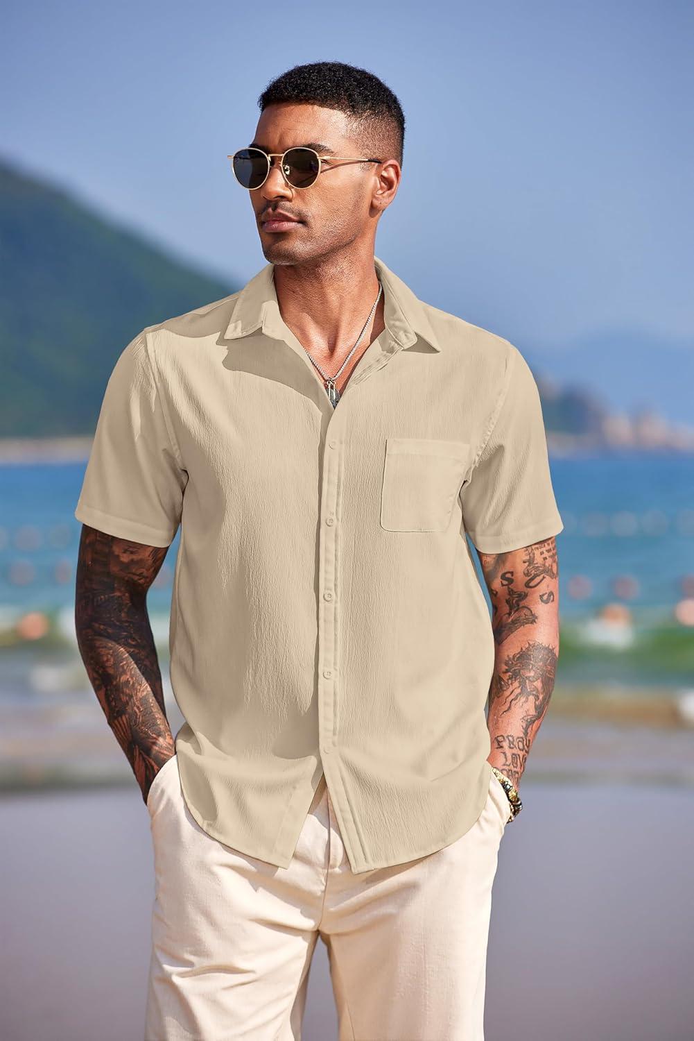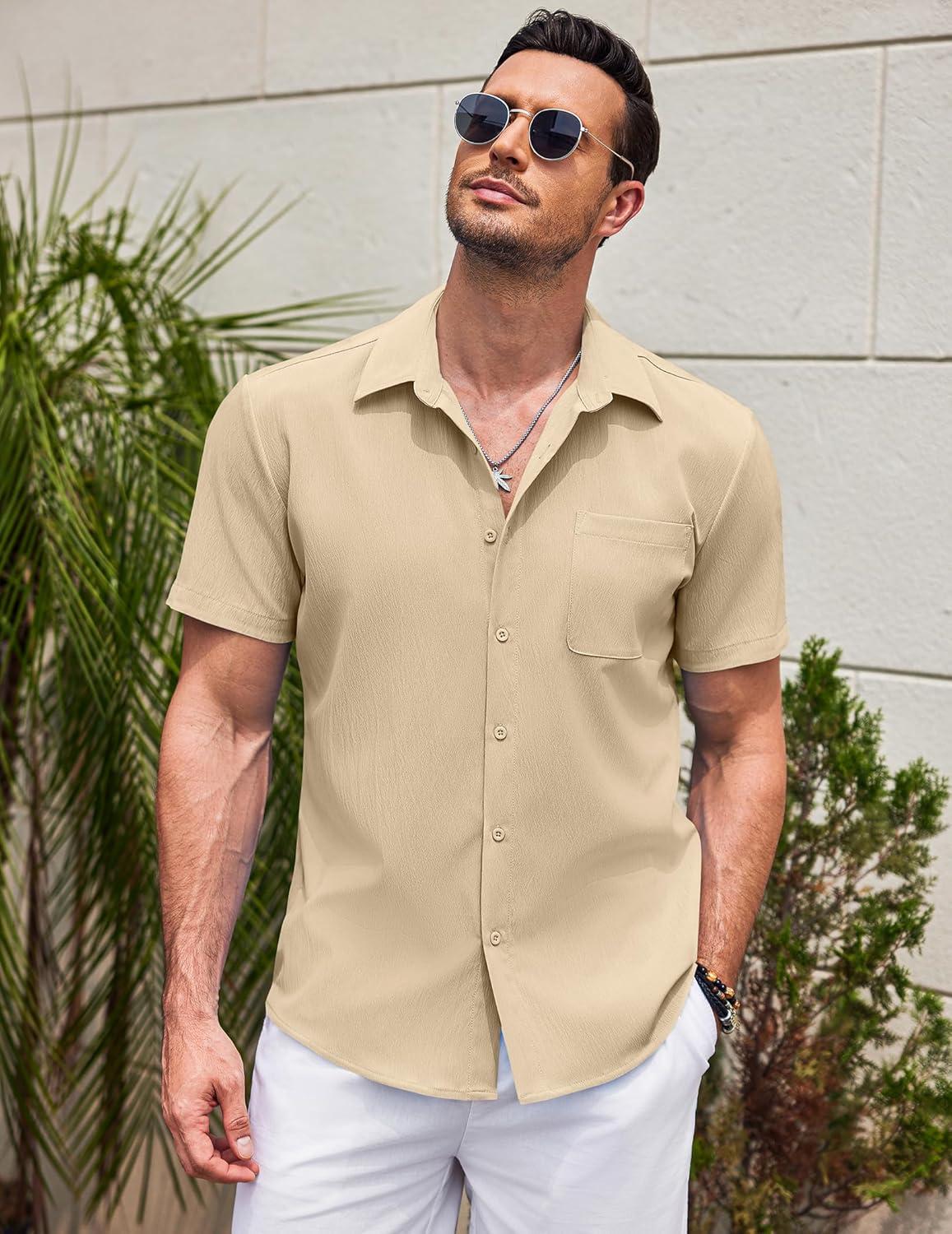 COOFANDY Men’s Casual Short Sleeve Button Down Summer Beach Shirt Lightweight Textured Wrinkle Free Untucked Shirts(Angel Falls)