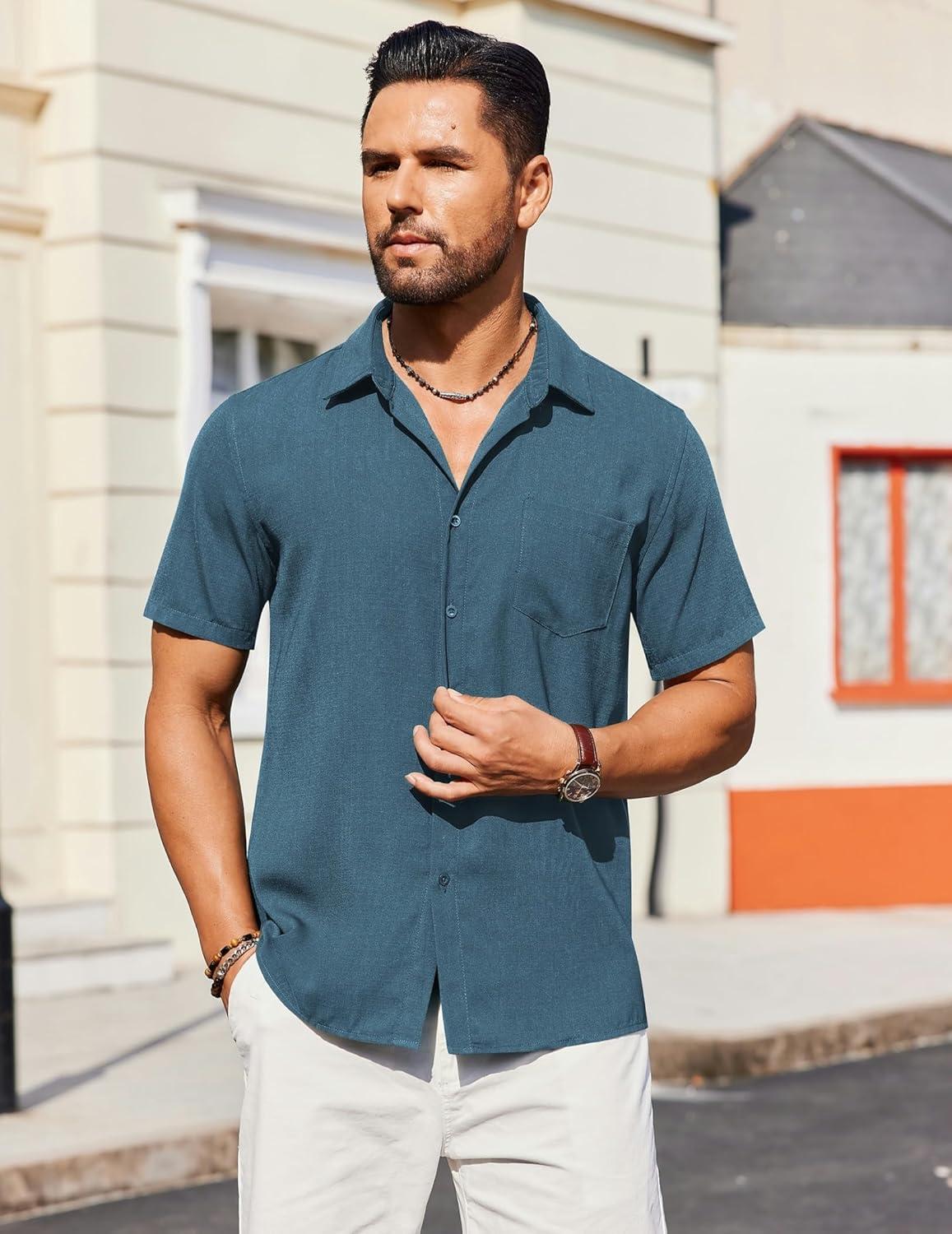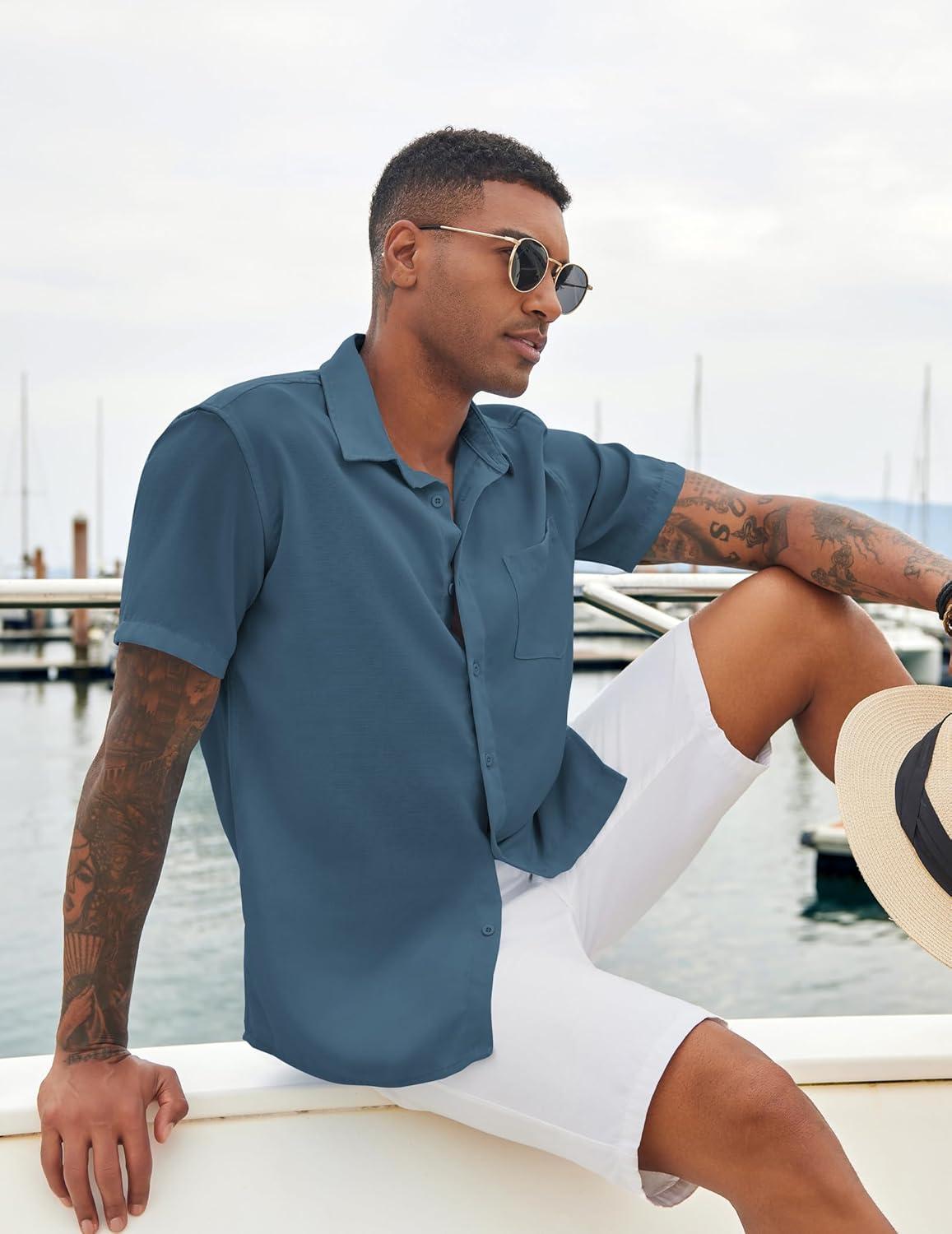 COOFANDY Mens Casual Short Sleeve Shirts Button Down Textured Shirts Summer Beach Shirt with Pocket(Grey Blue)