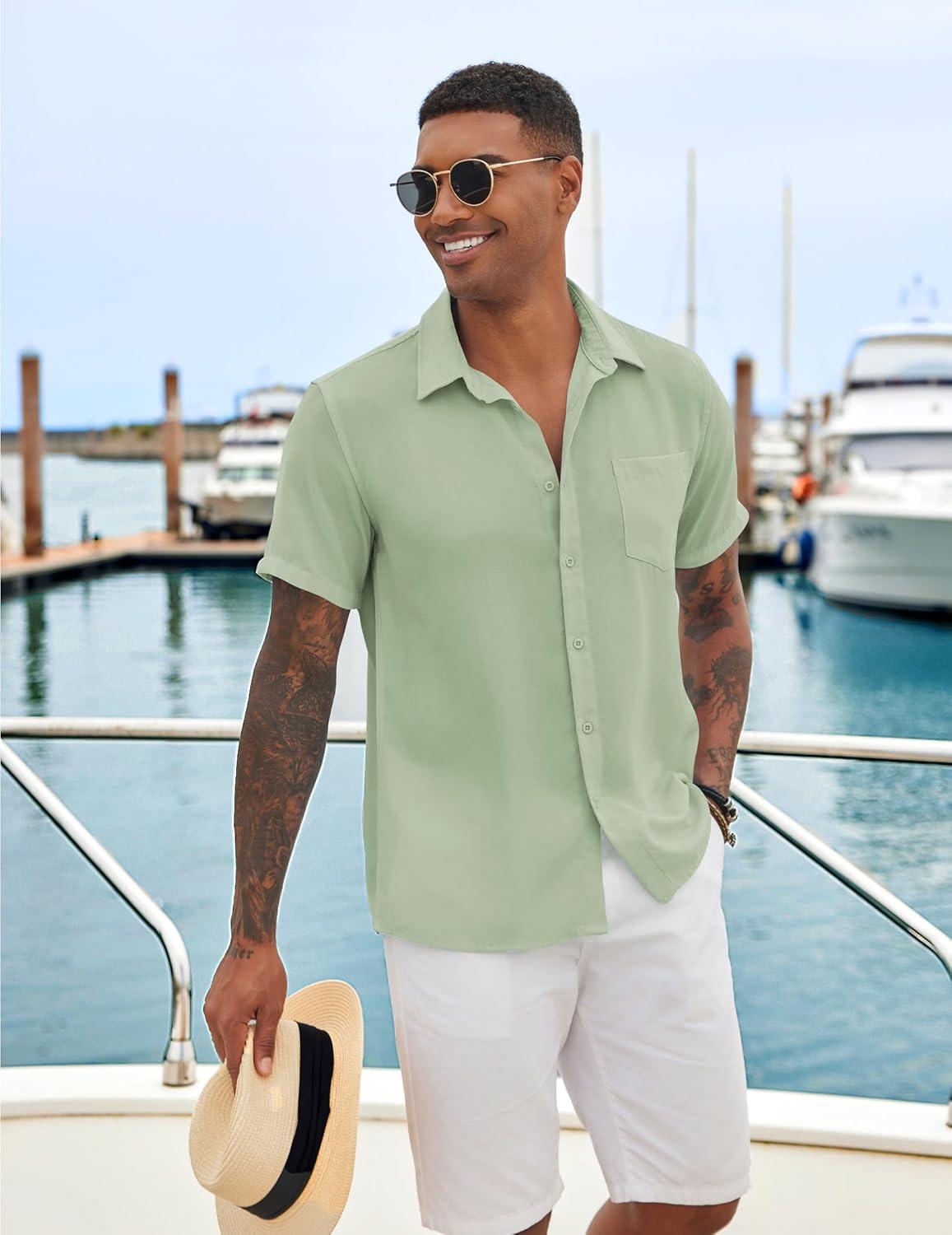 COOFANDY Mens Casual Short Sleeve Shirts Button Down Textured Shirts Summer Beach Shirt with Pocket(Light Green)