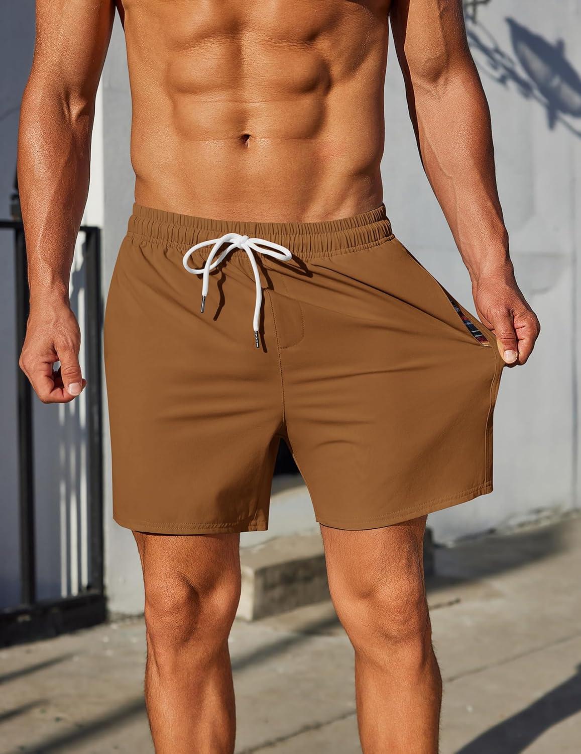 COOFANDY Mens Casual Shorts 5" Elastic Drawstring Shorts Summer Beach Athletic Shorts(Tan)