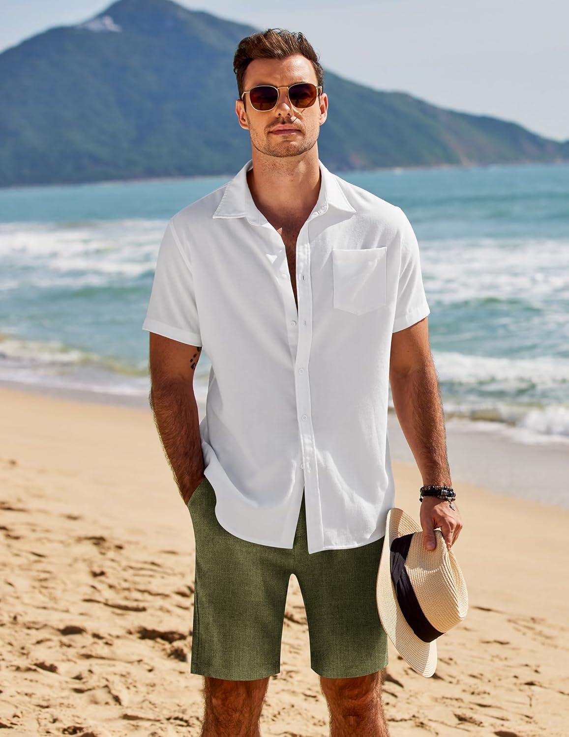 COOFANDY Mens Casual Shorts Elastic Waist Drawstring Shorts Summer Beach Linen Shorts(White)