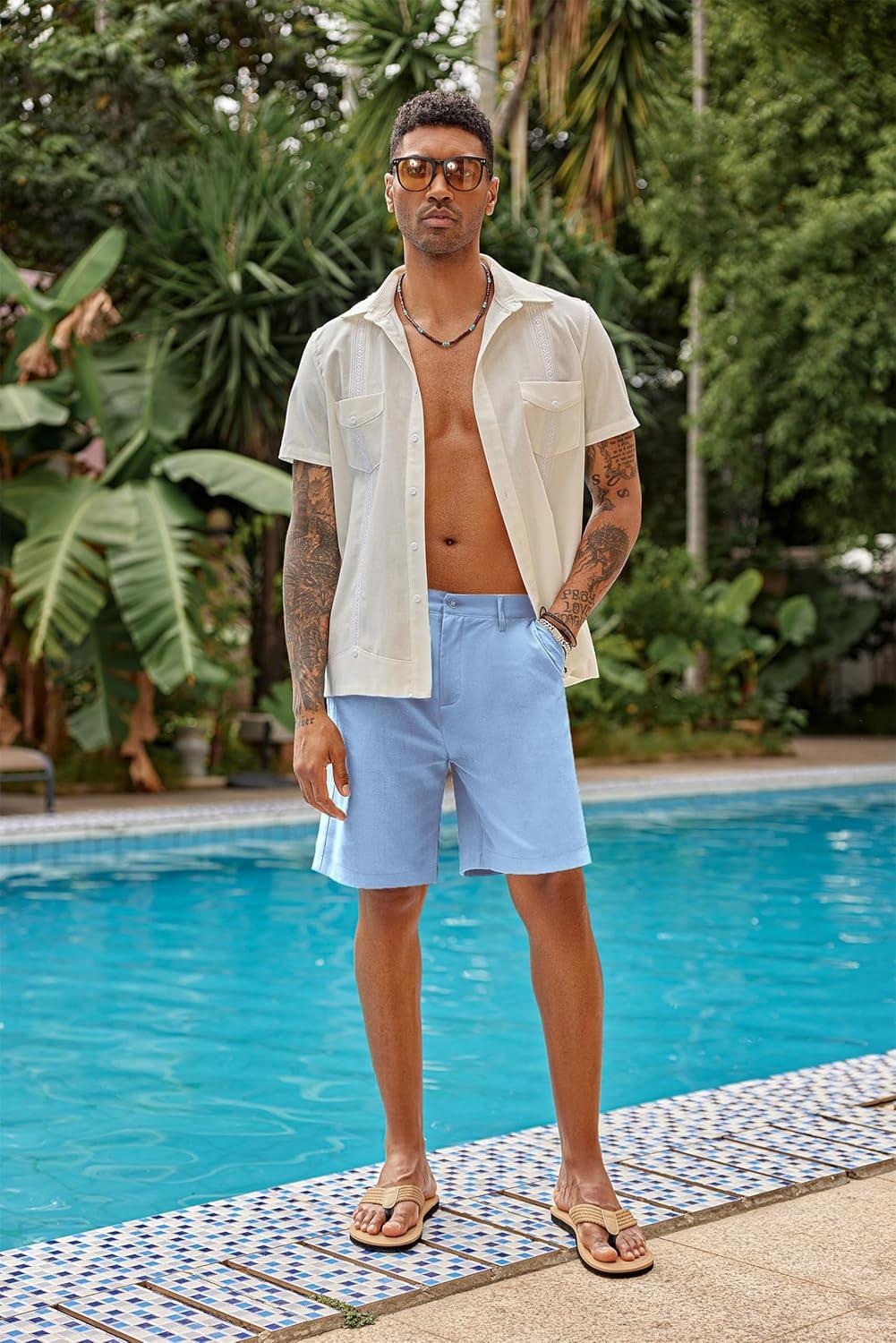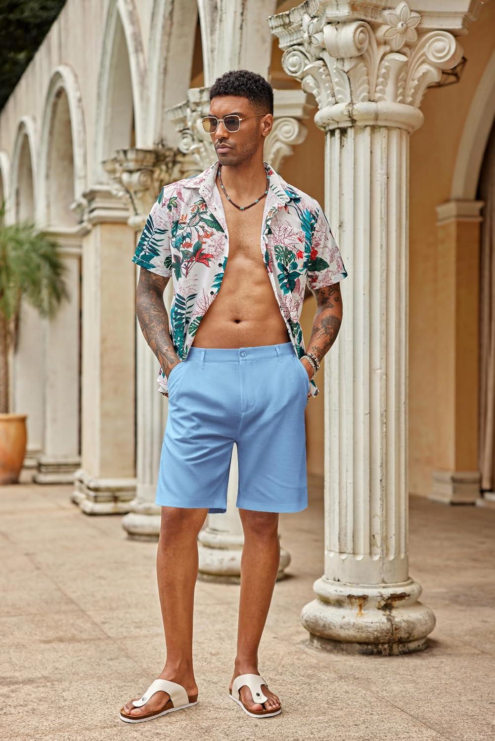 COOFANDY Men's Casual Shorts Linen Flat Front Shorts Elastic Waist Summer Beach Shorts(Blue)