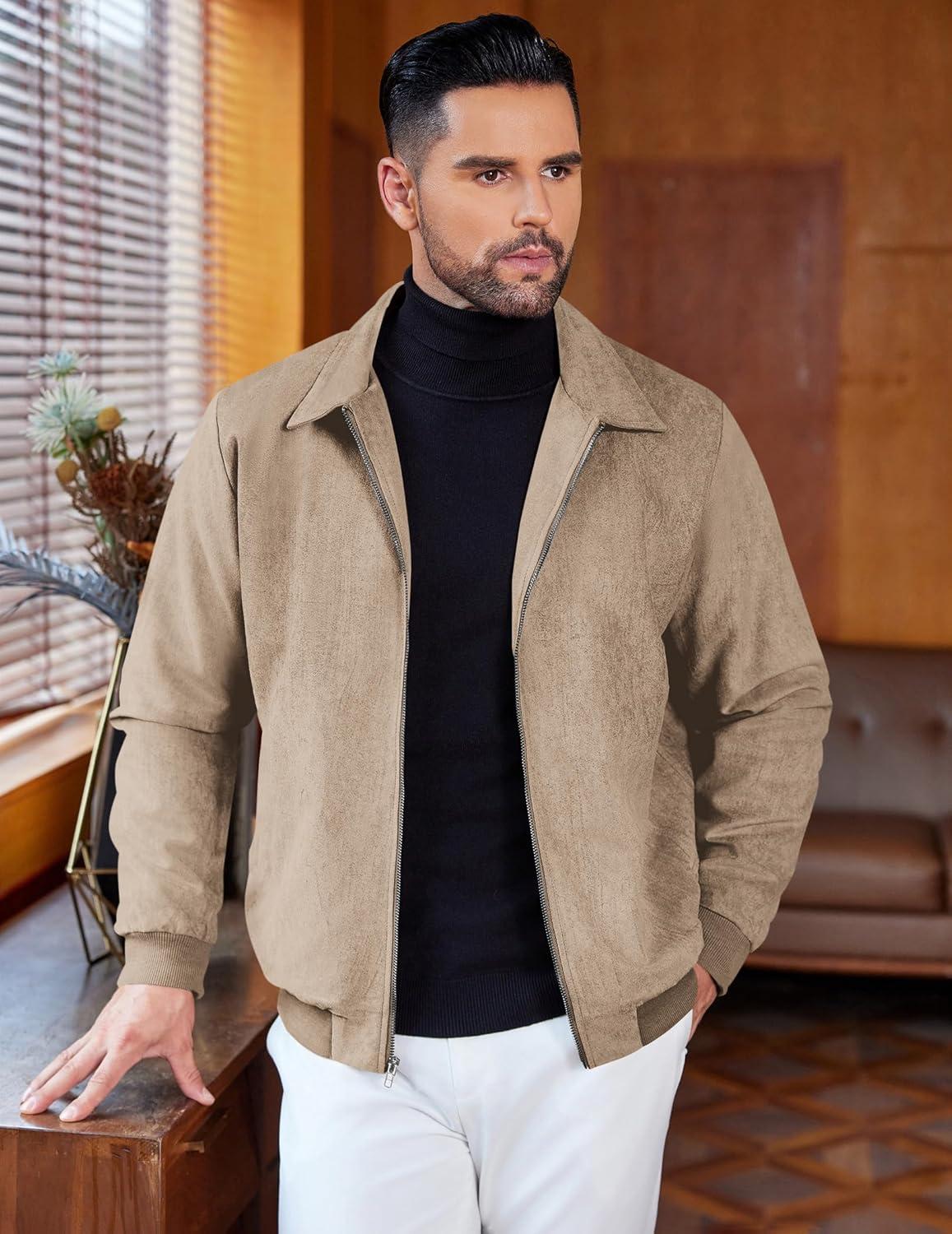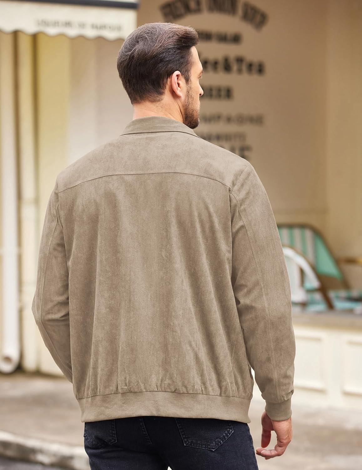 COOFANDY Men’s Casual Suede Bomber Jacket Lightweight Full Zip Up Jackets Vintage Faux Leather Jacket(Khaki)