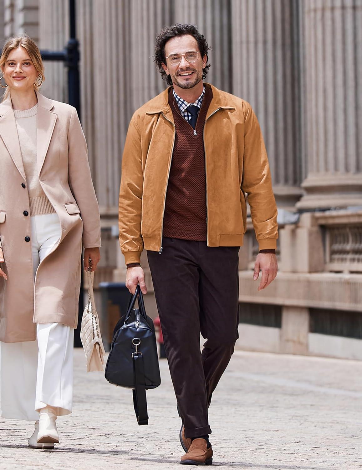 COOFANDY Men’s Casual Suede Bomber Jacket Lightweight Full Zip Up Jackets Vintage Faux Leather Jacket(Light Brown)