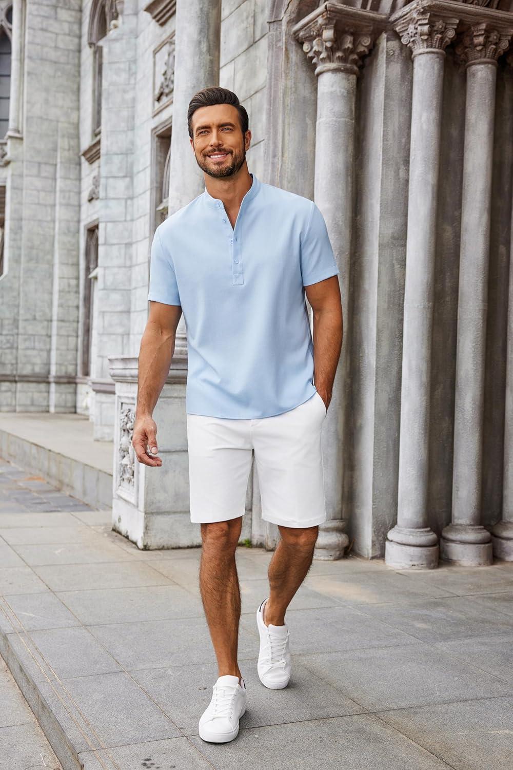 COOFANDY Men’s Casual Summer Beach Henley Shirt Band Collar Lightweight Hippie Tee Shirts(Light Blue)