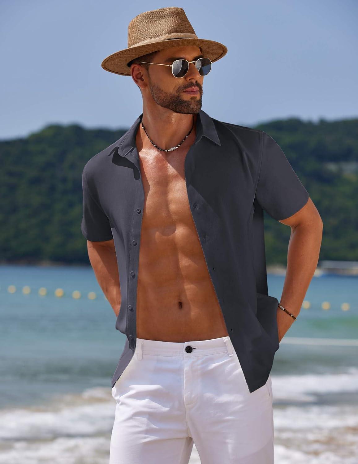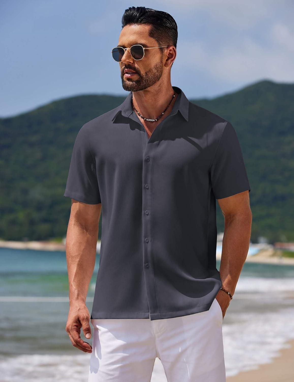 COOFANDY Mens Casual Summer Beach Shirt Button Down Short Sleeve Shirts Vacation Shirt Cotton Linen Shirts(Carbon Black)