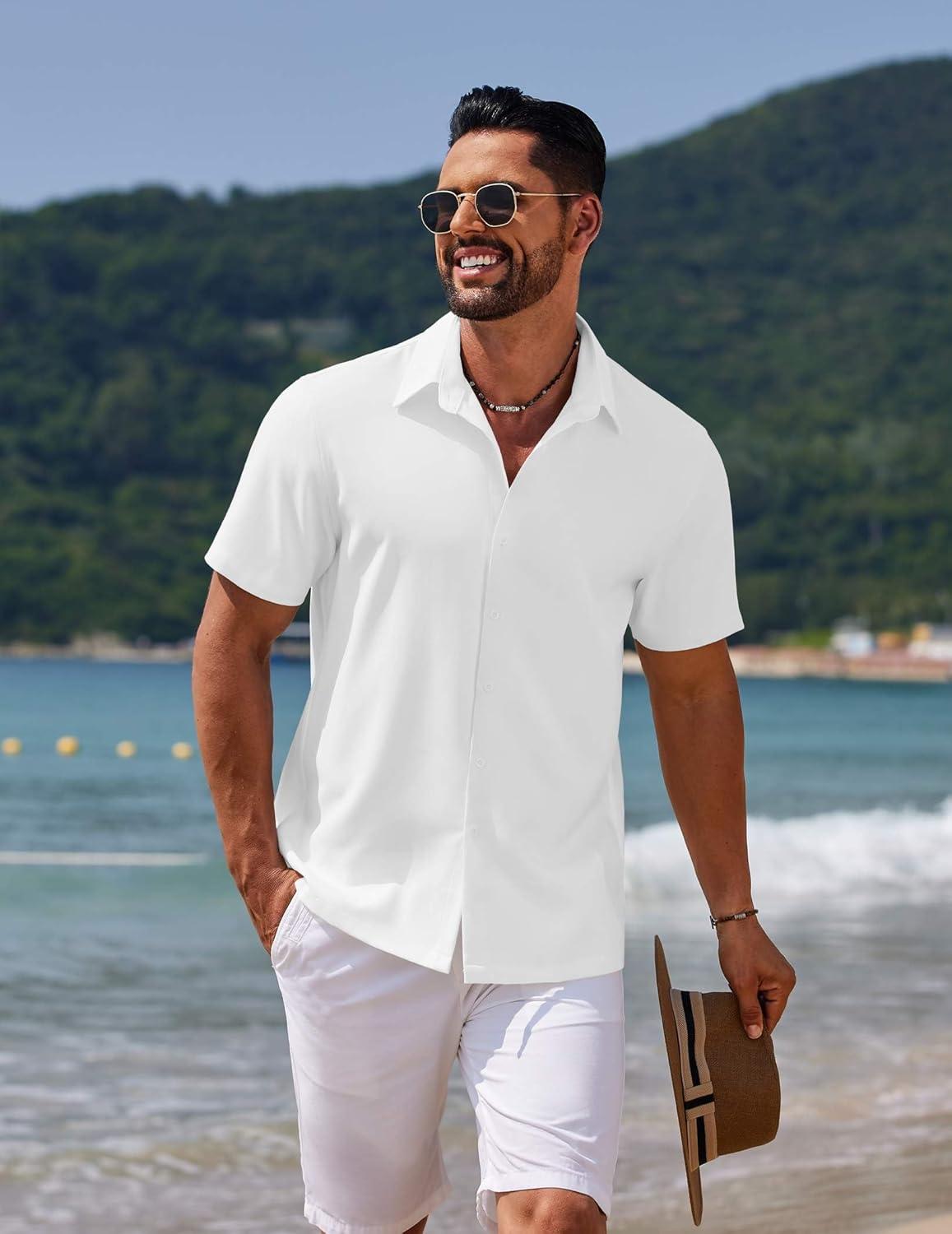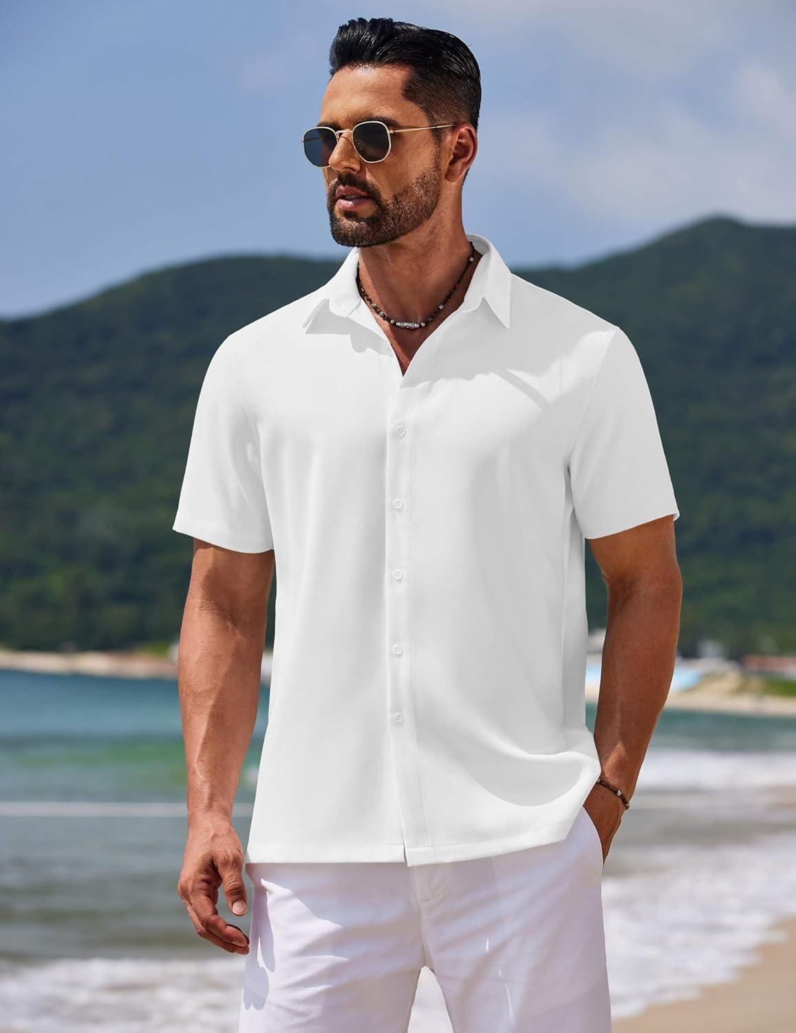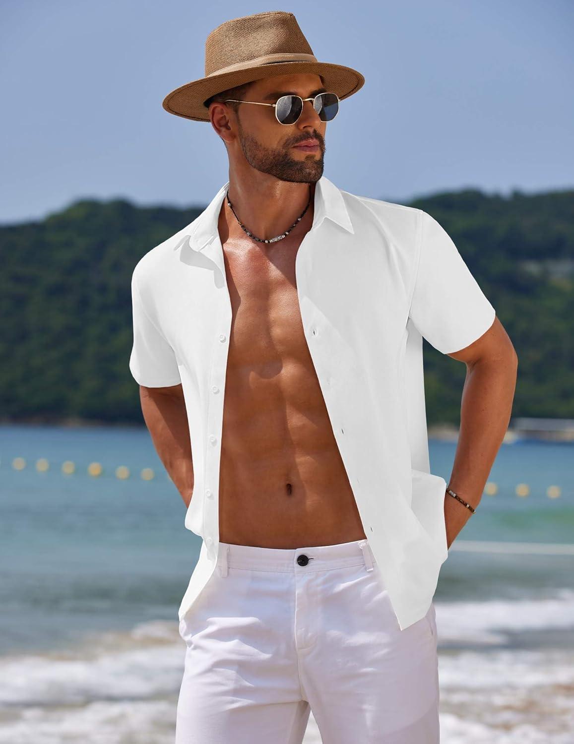 COOFANDY Mens Casual Summer Beach Shirt Button Down Short Sleeve Shirts Vacation Shirt Cotton Linen Shirts(White)
