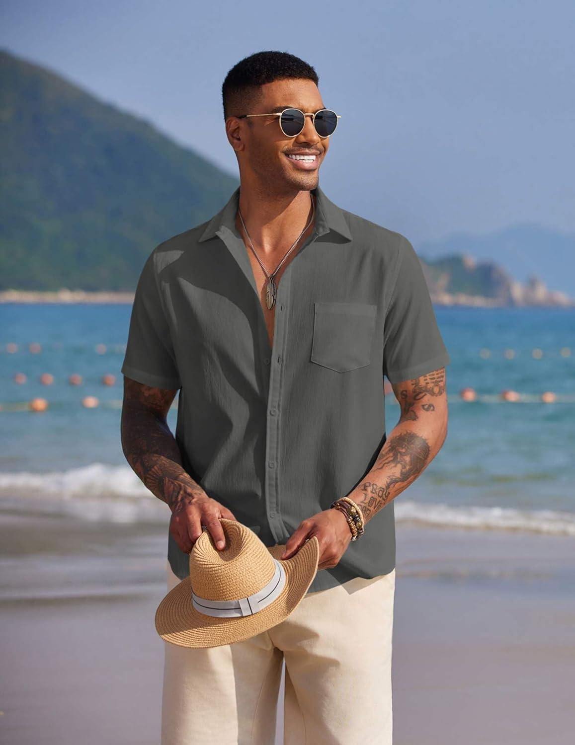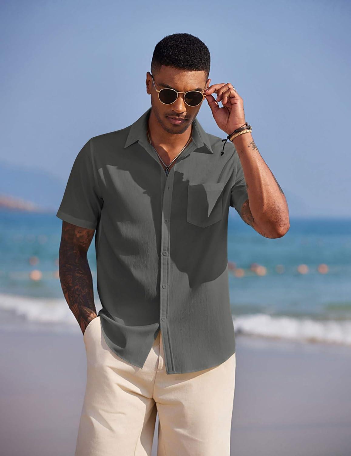 COOFANDY Men's Casual Summer Beach Wrinkle Free Shirts Short Sleeve Button Down Lightweight Untucked Textured Shirt(Dark Gray)