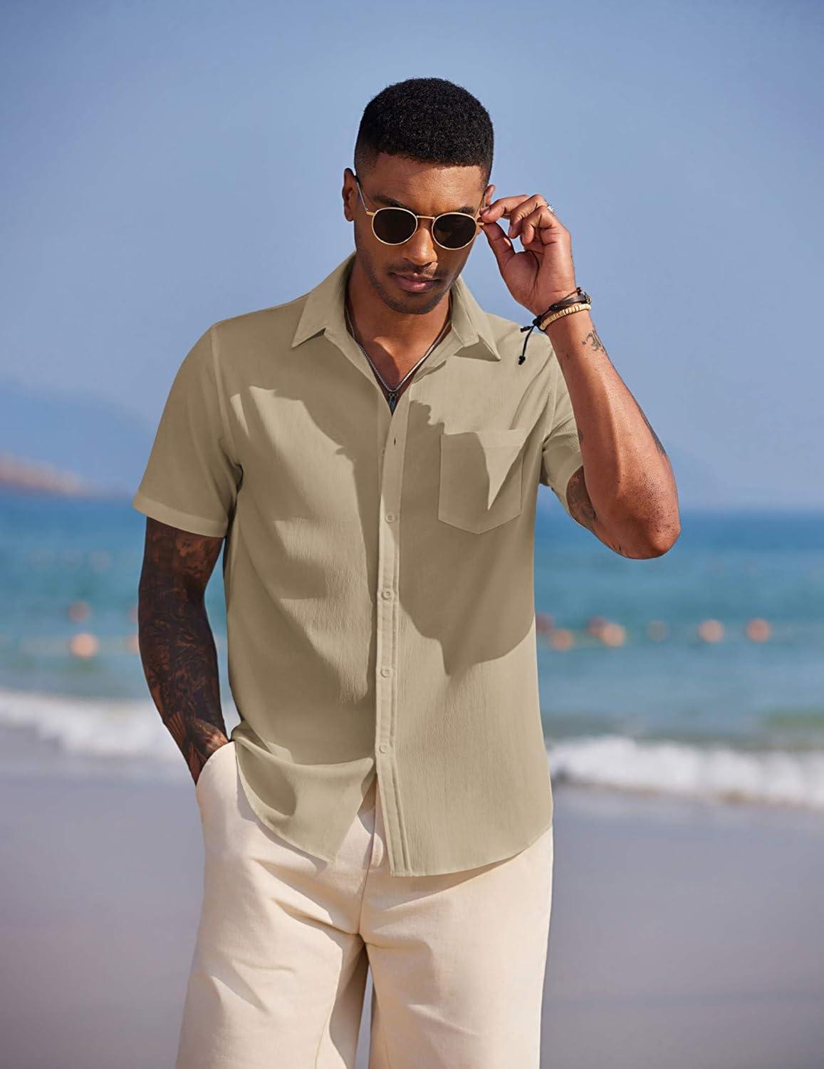 imageCOOFANDY Mens Casual Summer Beach Wrinkle Free Shirts Short Sleeve Button Down Lightweight Untucked Textured ShirtAlmond