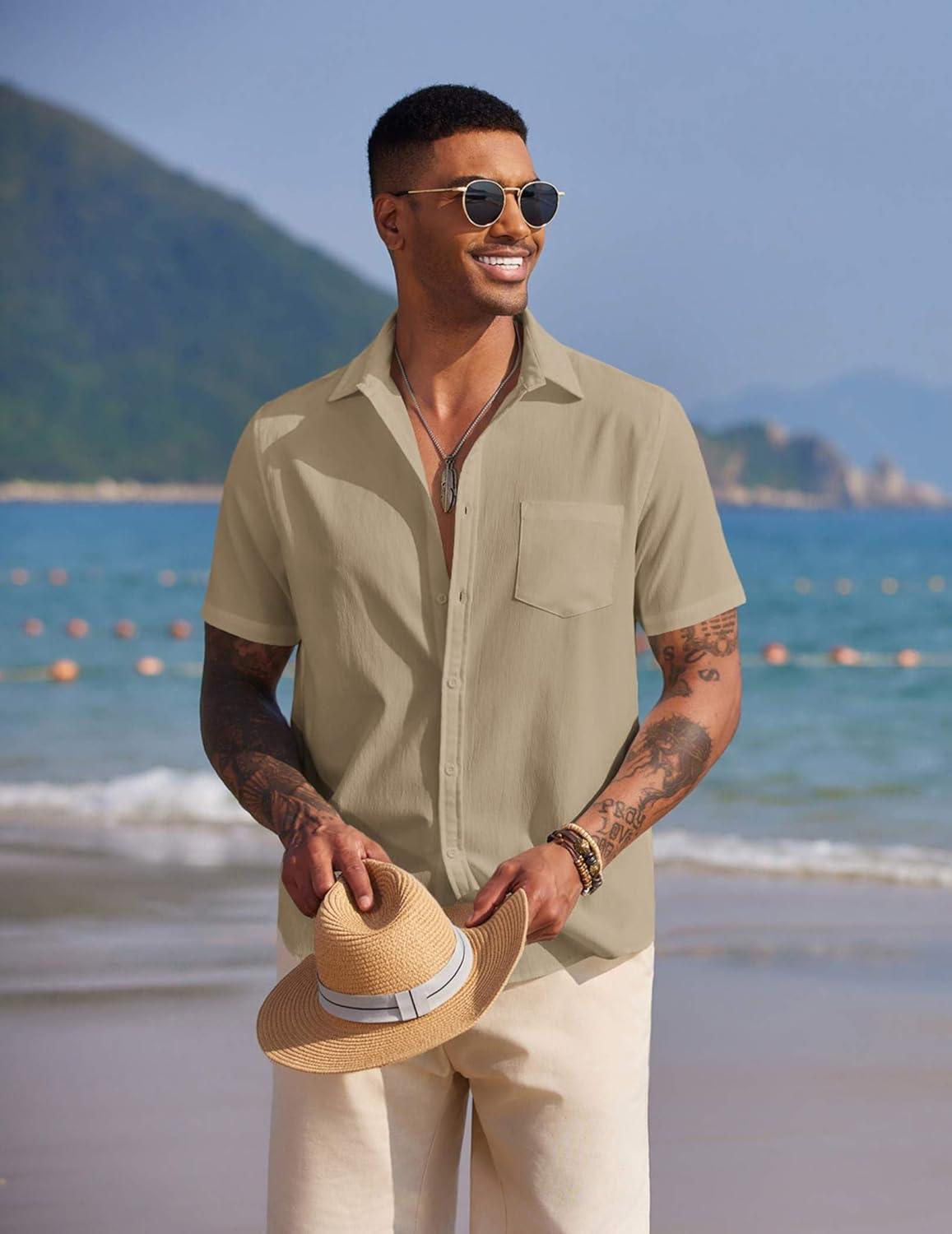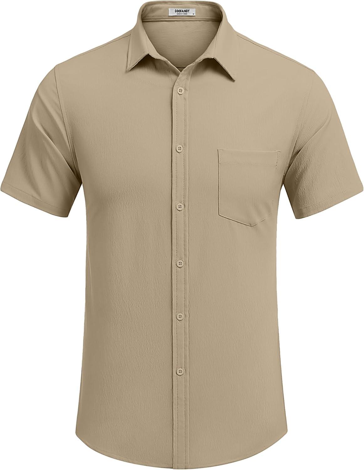 COOFANDY Men’s Casual Summer Beach Wrinkle Free Shirts Short Sleeve Button Down Lightweight Untucked Textured Shirt(Almond)