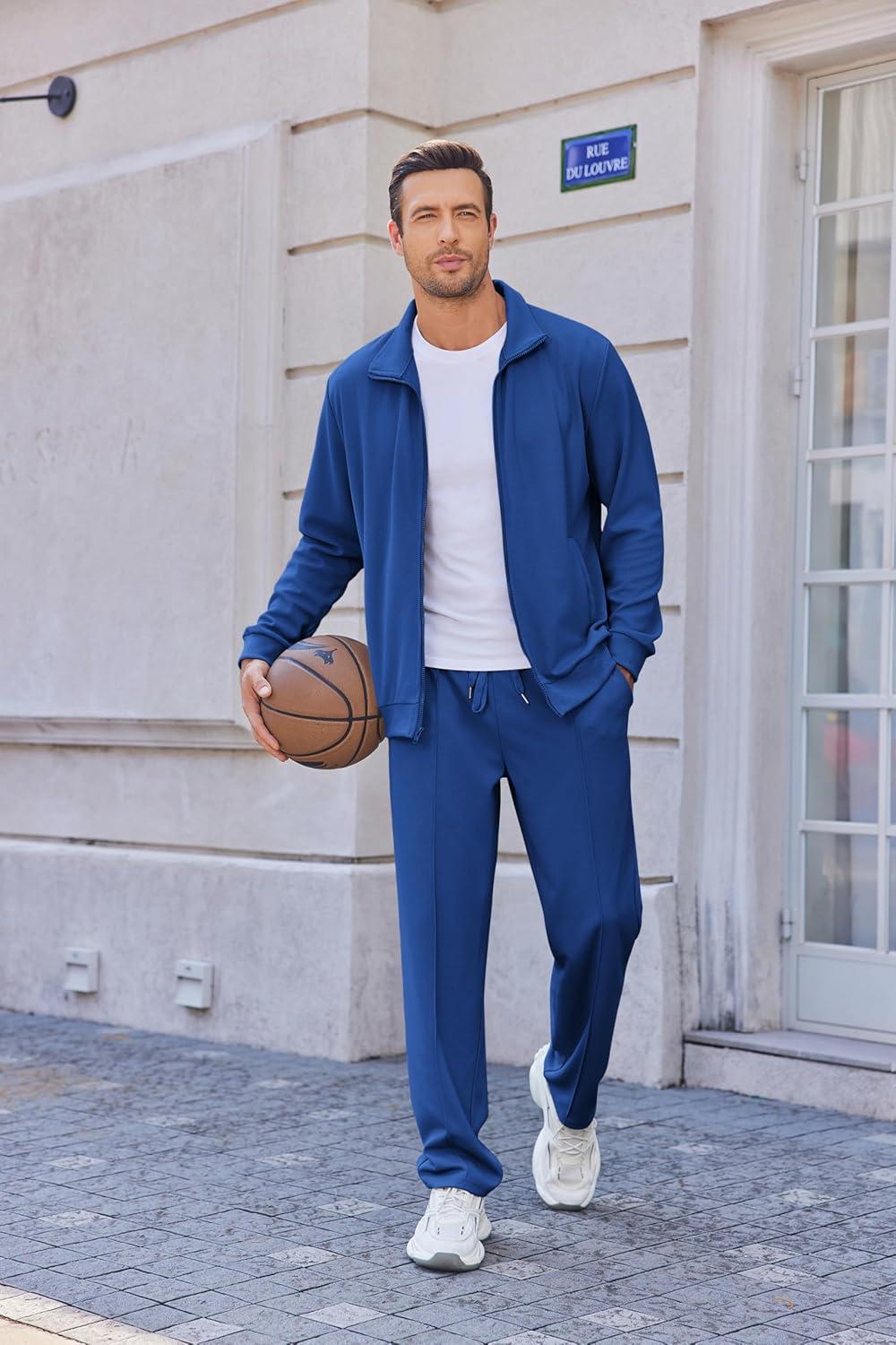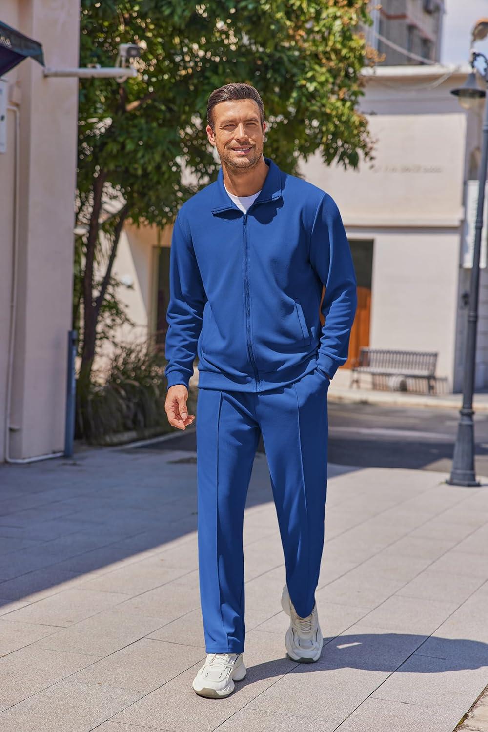 COOFANDY Men’s Casual Sweatsuit 2 Piece Athletic Full Zip Tracksuit Jacquard Jogging Set Fashion Jackets And Pants Outfit(Blue)