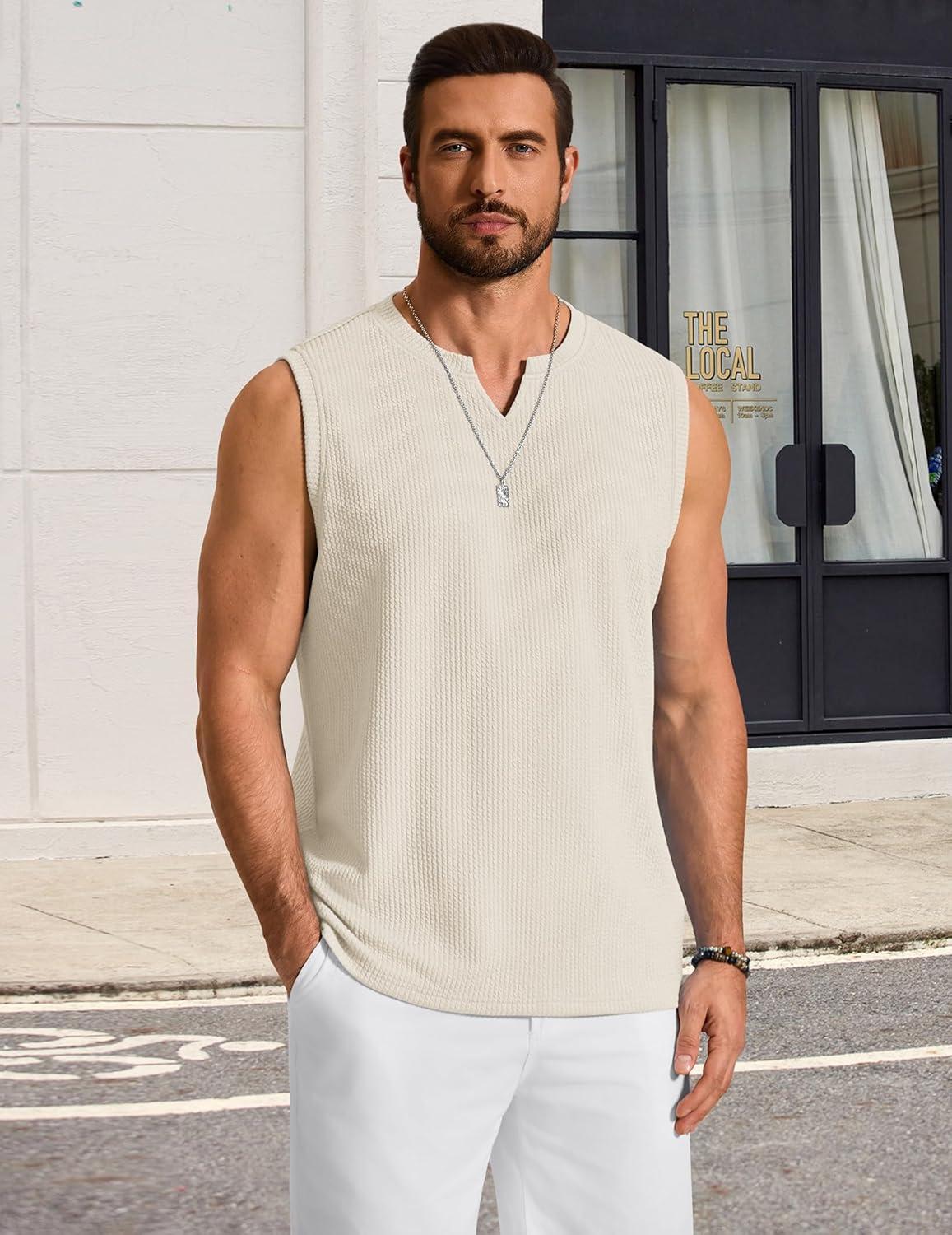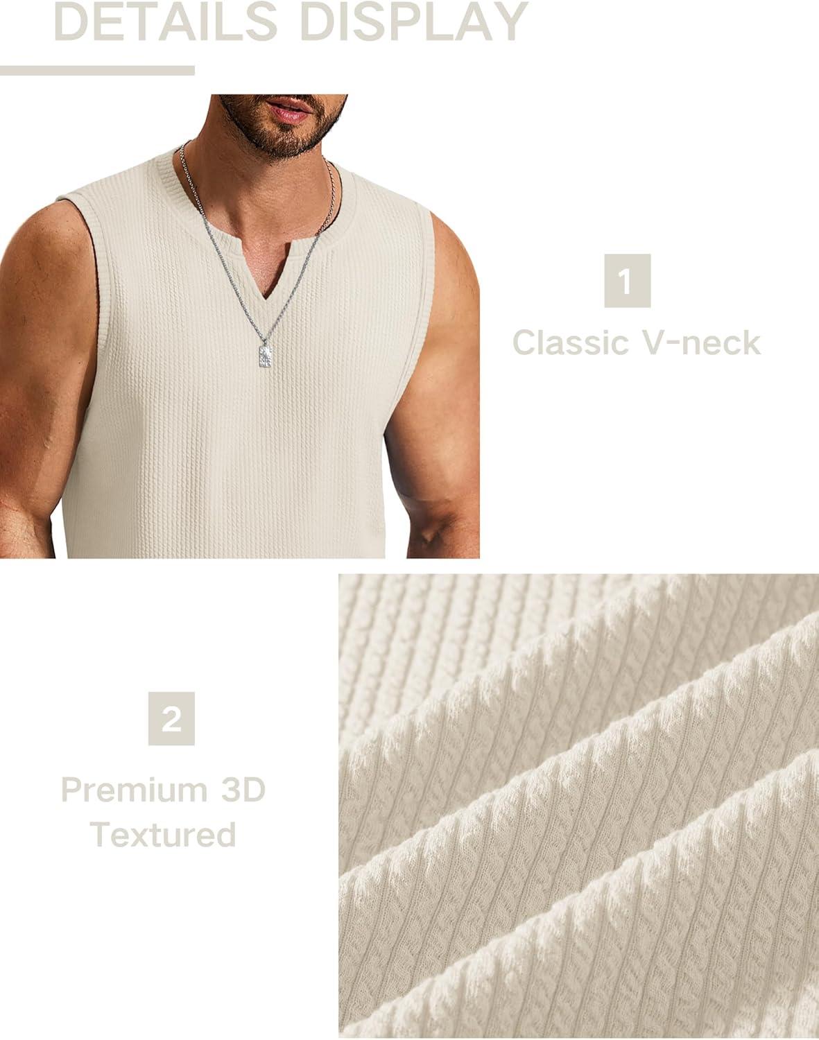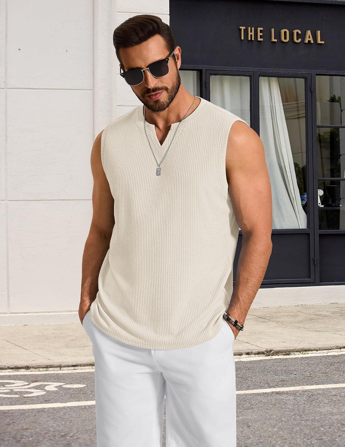 COOFANDY Mens Casual Tank Top V Neck Knit Jacquard Sleeveless T Shirts Lightweight Summer Beach Textured Tank(Beige)