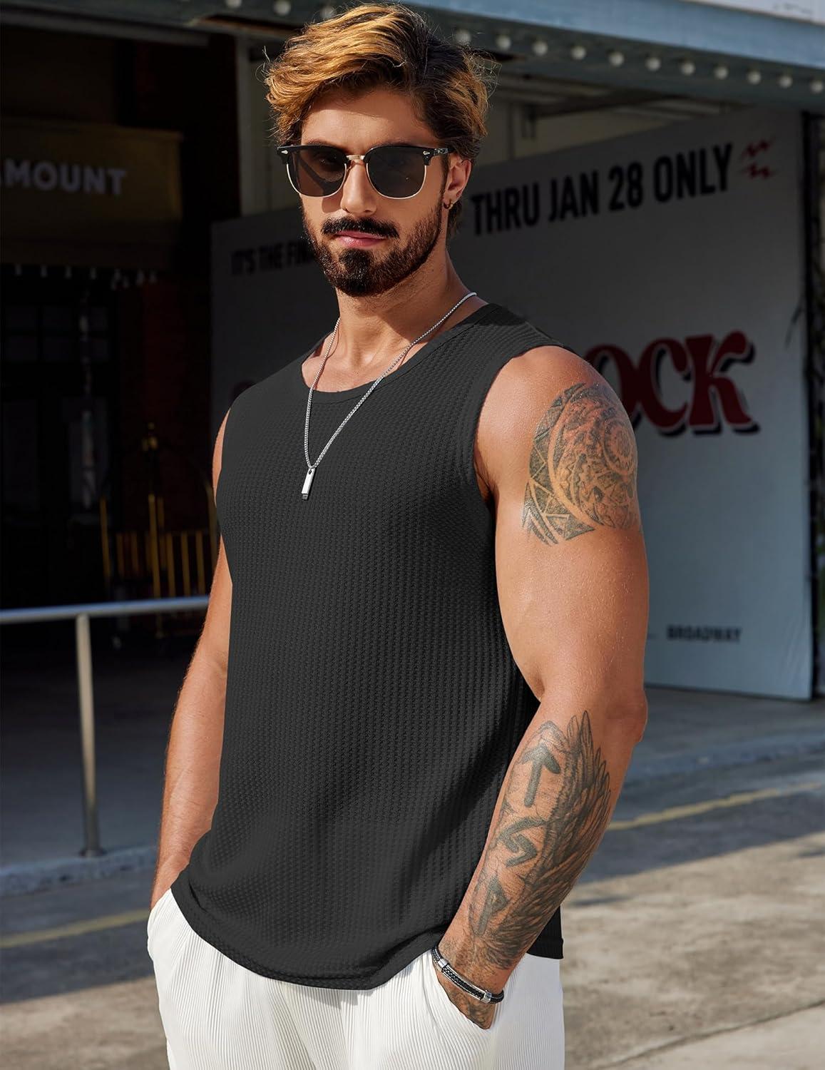 COOFANDY Mens Casual Tank Tops 2 Pack Waffle Knit Sleeveless Shirt Breathable Tank Shirts Summer Muscle Tee(Black)