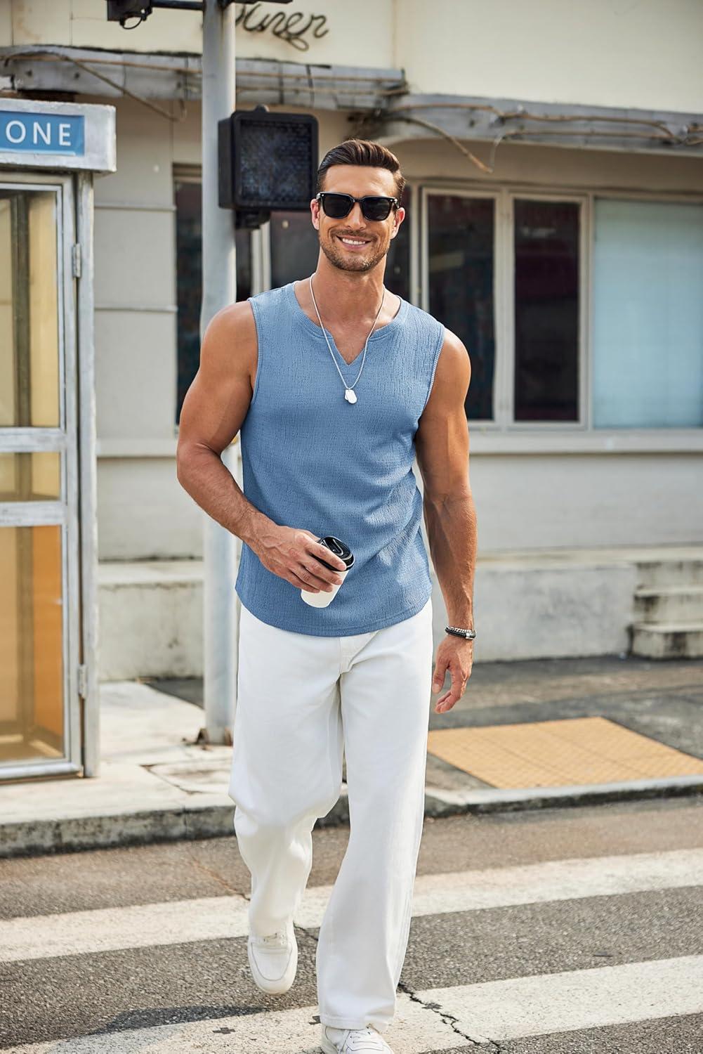 COOFANDY Men’s Casual Tank Tops Knit V Neck Sleeveless T Shirts 2 Pack Summer Beach Lightweight Muscle Tee(White/Blue)