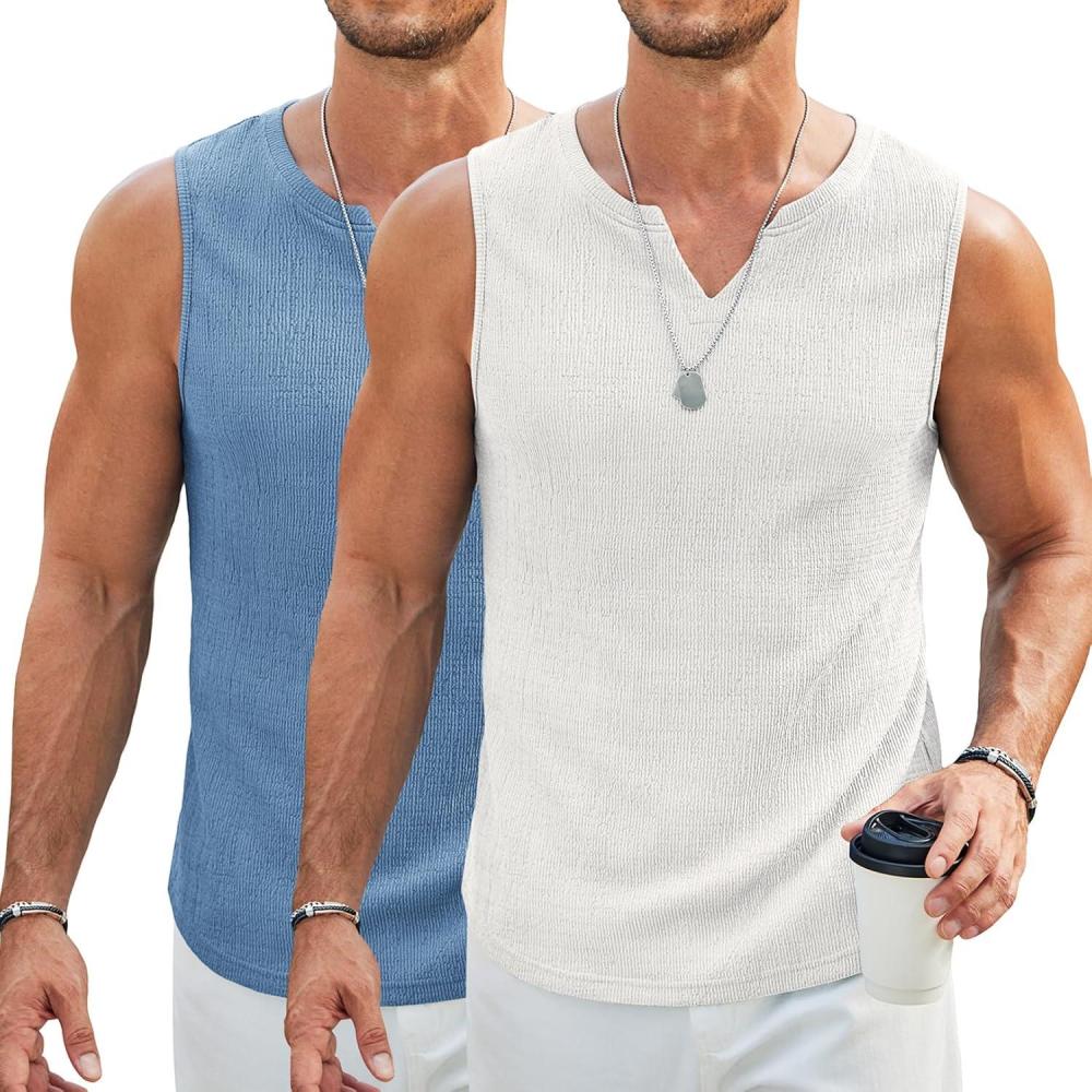 imageCOOFANDY Mens Casual Tank Tops Knit V Neck Sleeveless T Shirts 2 Pack Summer Beach Lightweight Muscle TeeWhiteBlue