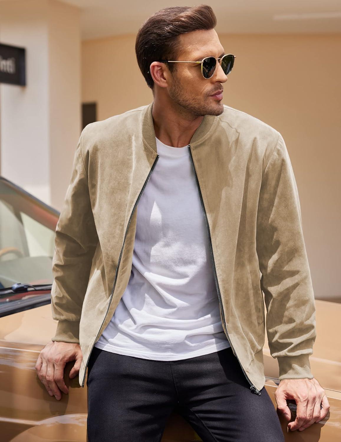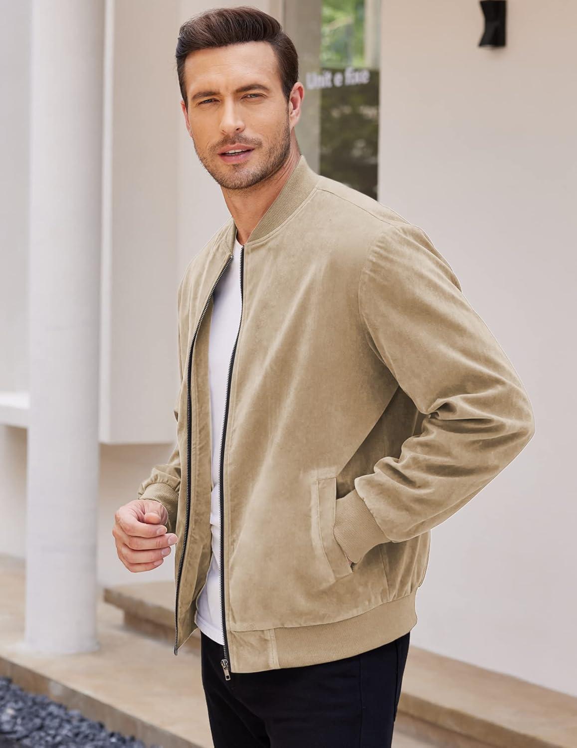 COOFANDY Men’s Casual Varsity Jacket Vintage Lightweight Suede Bomber Jackets(Light Tan)