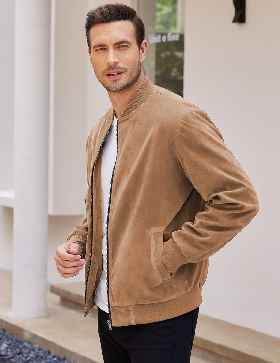 COOFANDY Men’s Casual Varsity Jacket Vintage Lightweight Suede Bomber Jackets(Light Tan)
