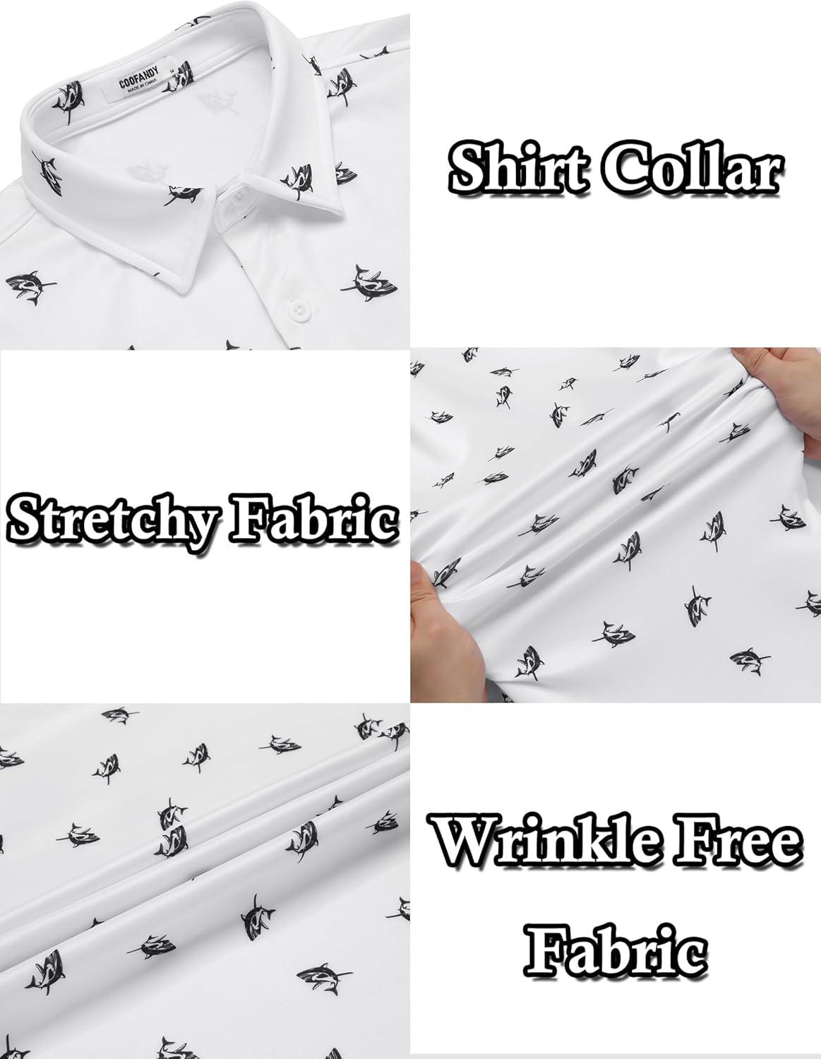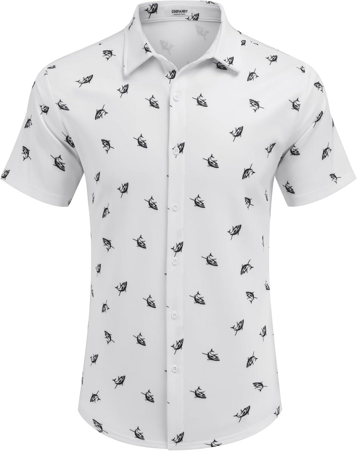 COOFANDY Mens Casual Wrinkle Free Shirts Short Sleeve Button Down Summer Stretch Dress Shirt(White Full Shark)