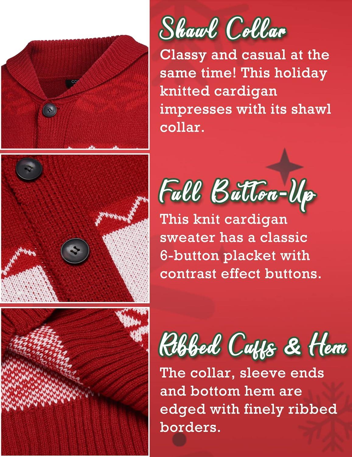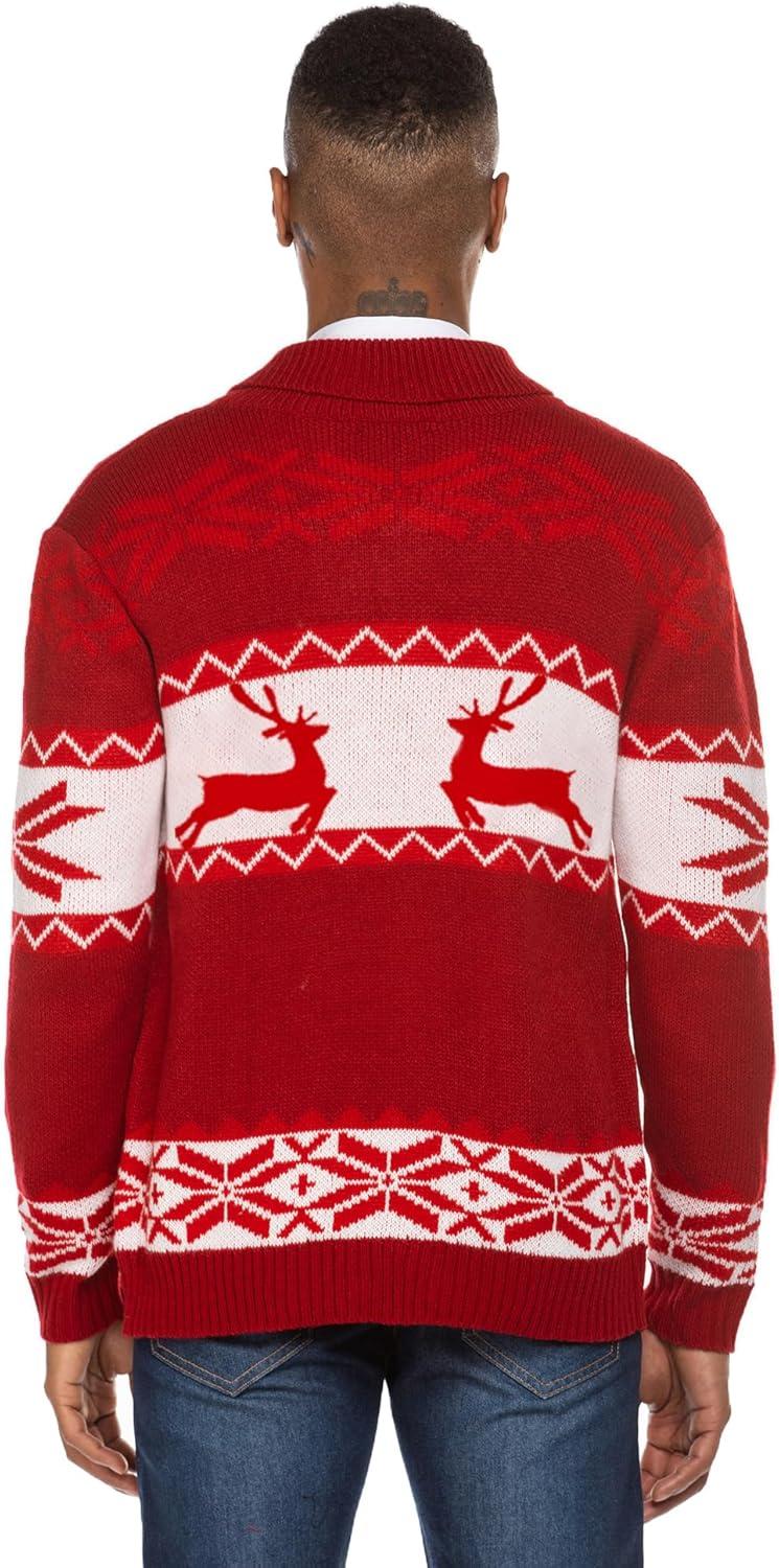 COOFANDY Men’s Christmas Cardigans Ugly Xmas Sweaters Reindeer Snowflake Shawl Collar Knitted Cardigan Sweater(A – Red – a)