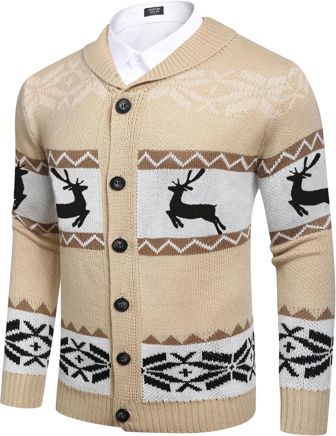 COOFANDY Men’s Christmas Cardigans Ugly Xmas Sweaters Reindeer Snowflake Shawl Collar Knitted Cardigan Sweater(Light Apricot)