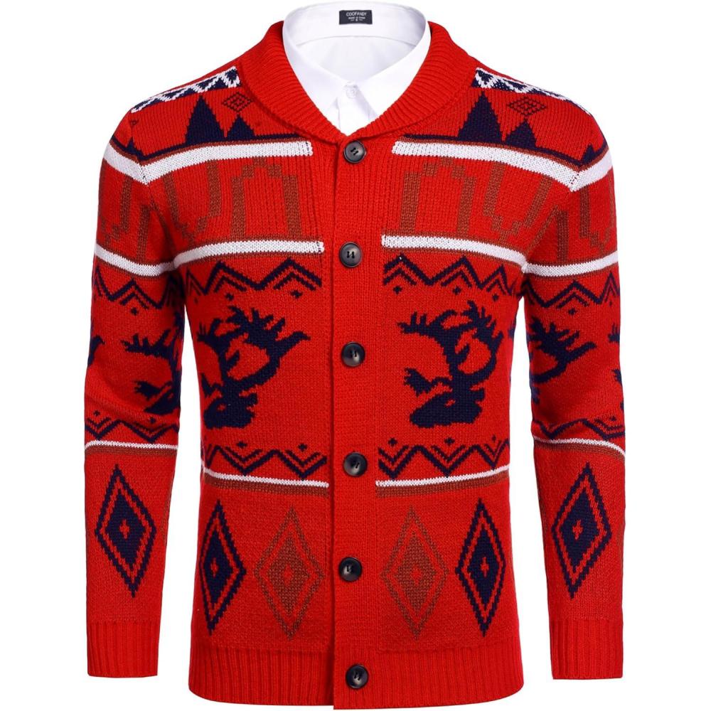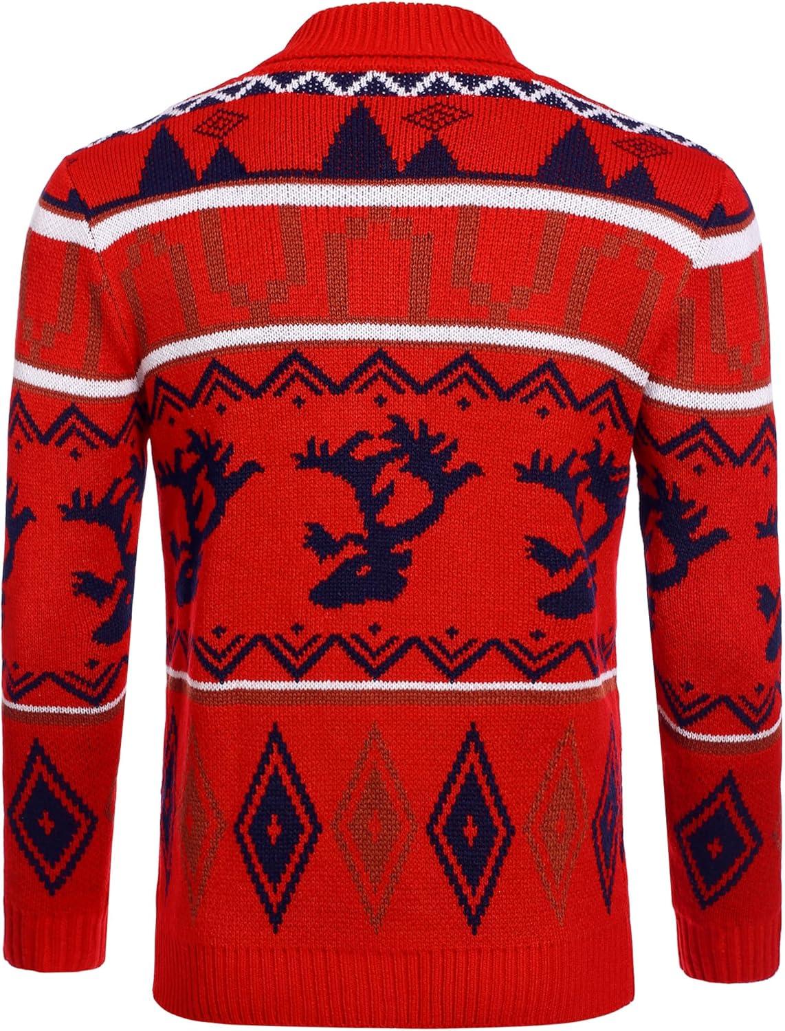 COOFANDY Men’s Christmas Cardigans Ugly Xmas Sweaters Reindeer Snowflake Shawl Collar Knitted Cardigan Sweater(Red Elk)