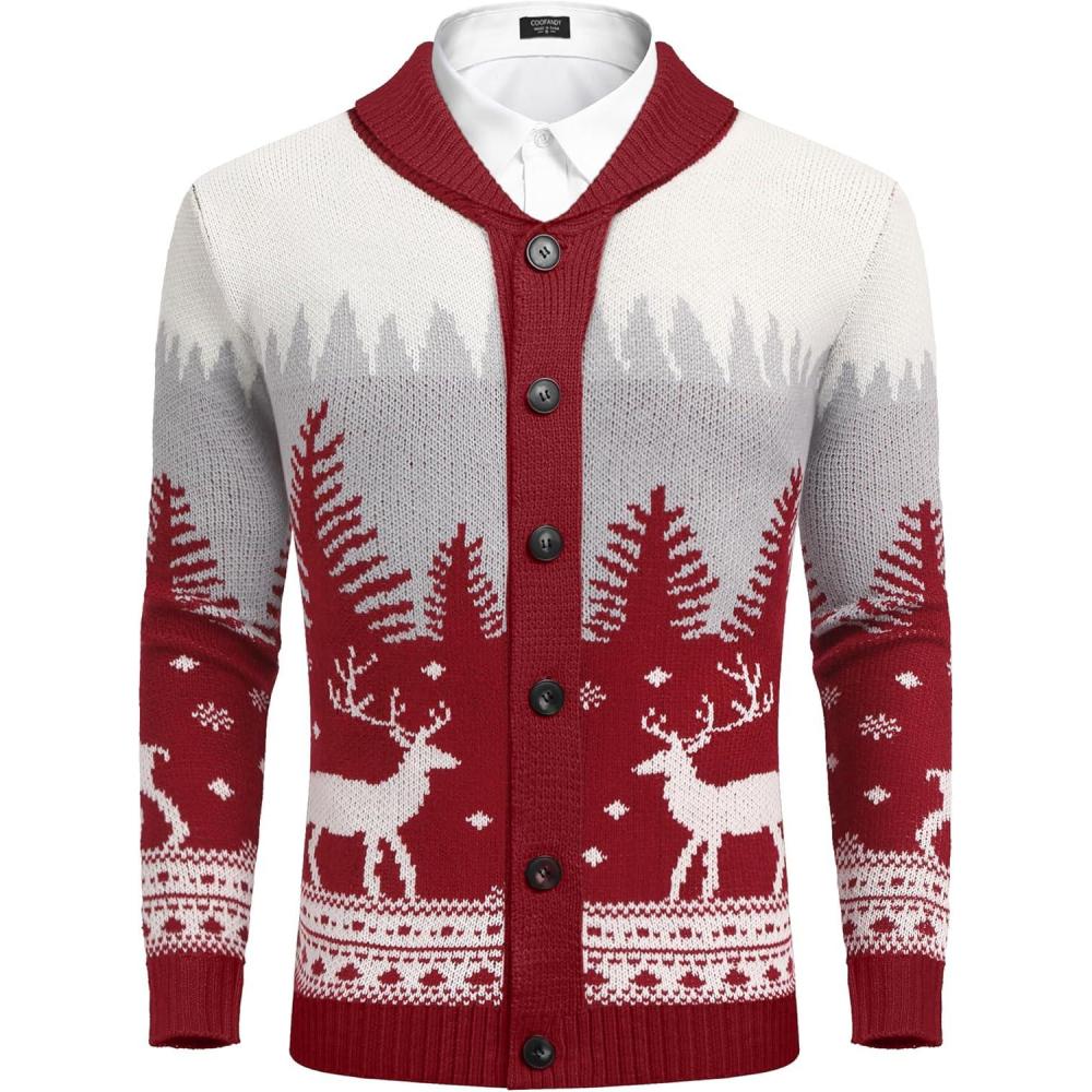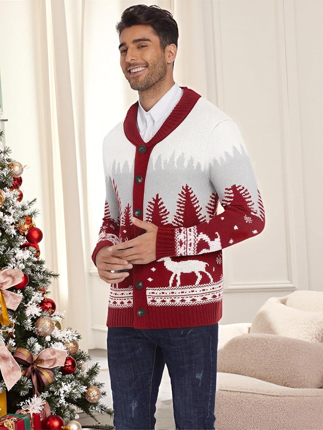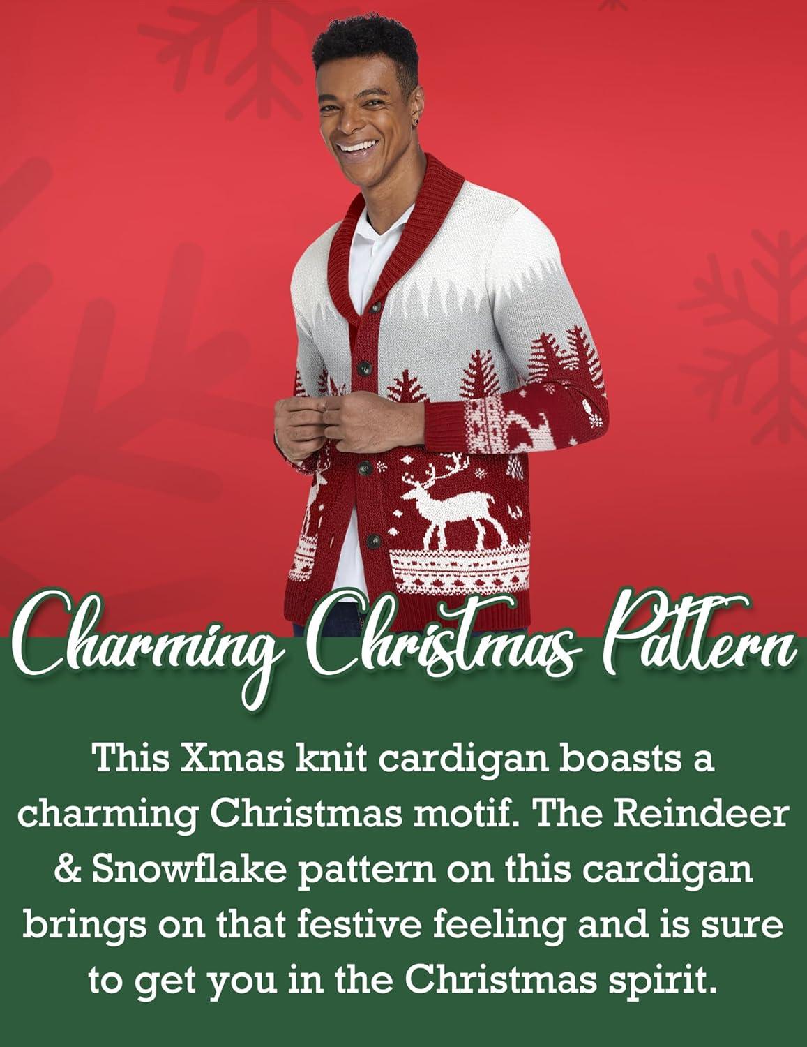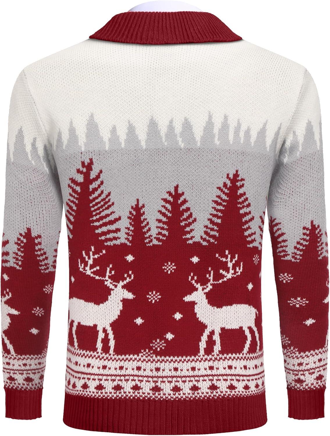 COOFANDY Men’s Christmas Cardigans Ugly Xmas Sweaters Reindeer Snowflake Shawl Collar Knitted Cardigan Sweater(Red-white-gray)