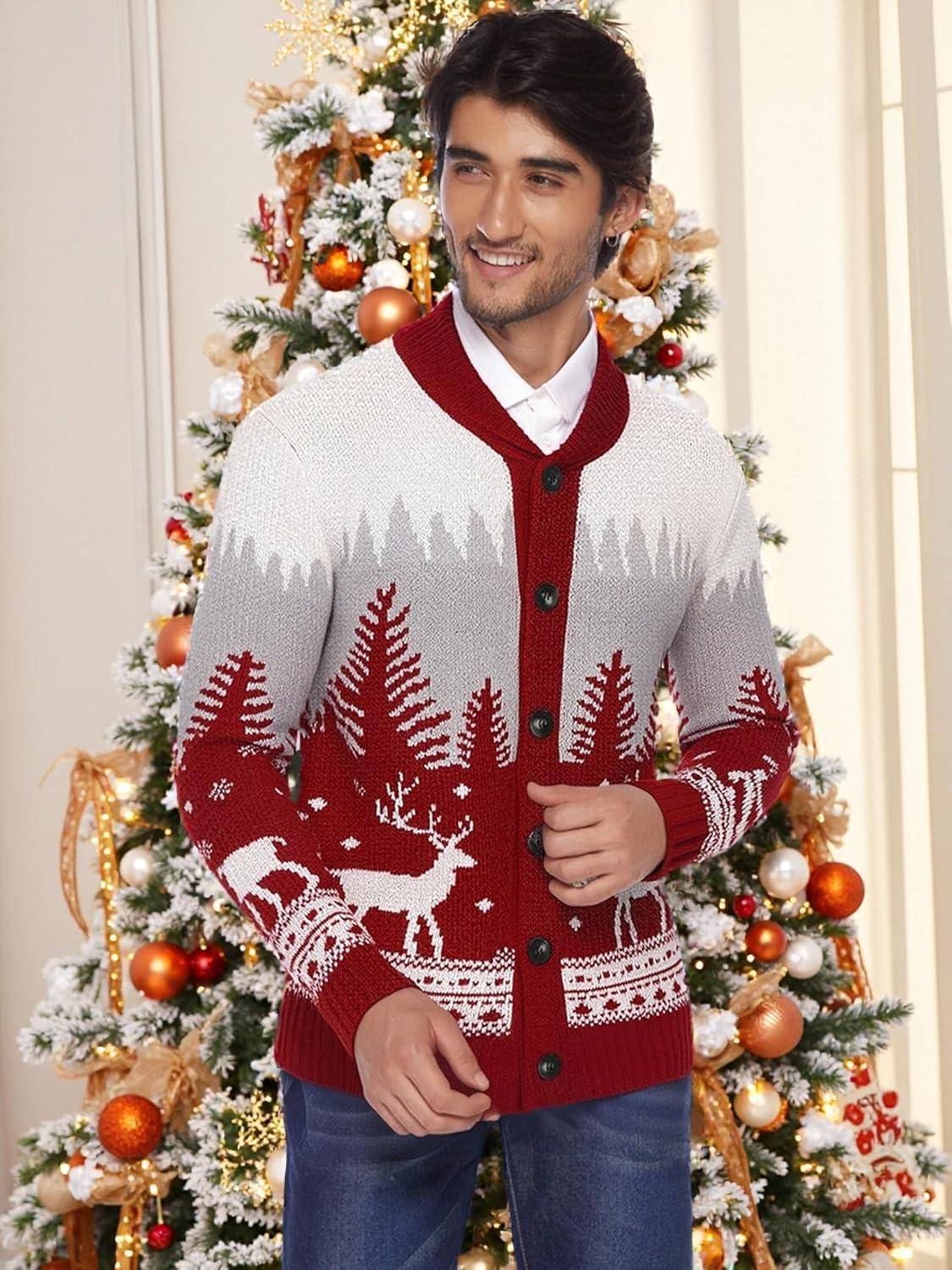 COOFANDY Men's Christmas Cardigans Ugly Xmas Sweaters Reindeer Snowflake Shawl Collar Knitted Cardigan Sweater(Red-white-gray)