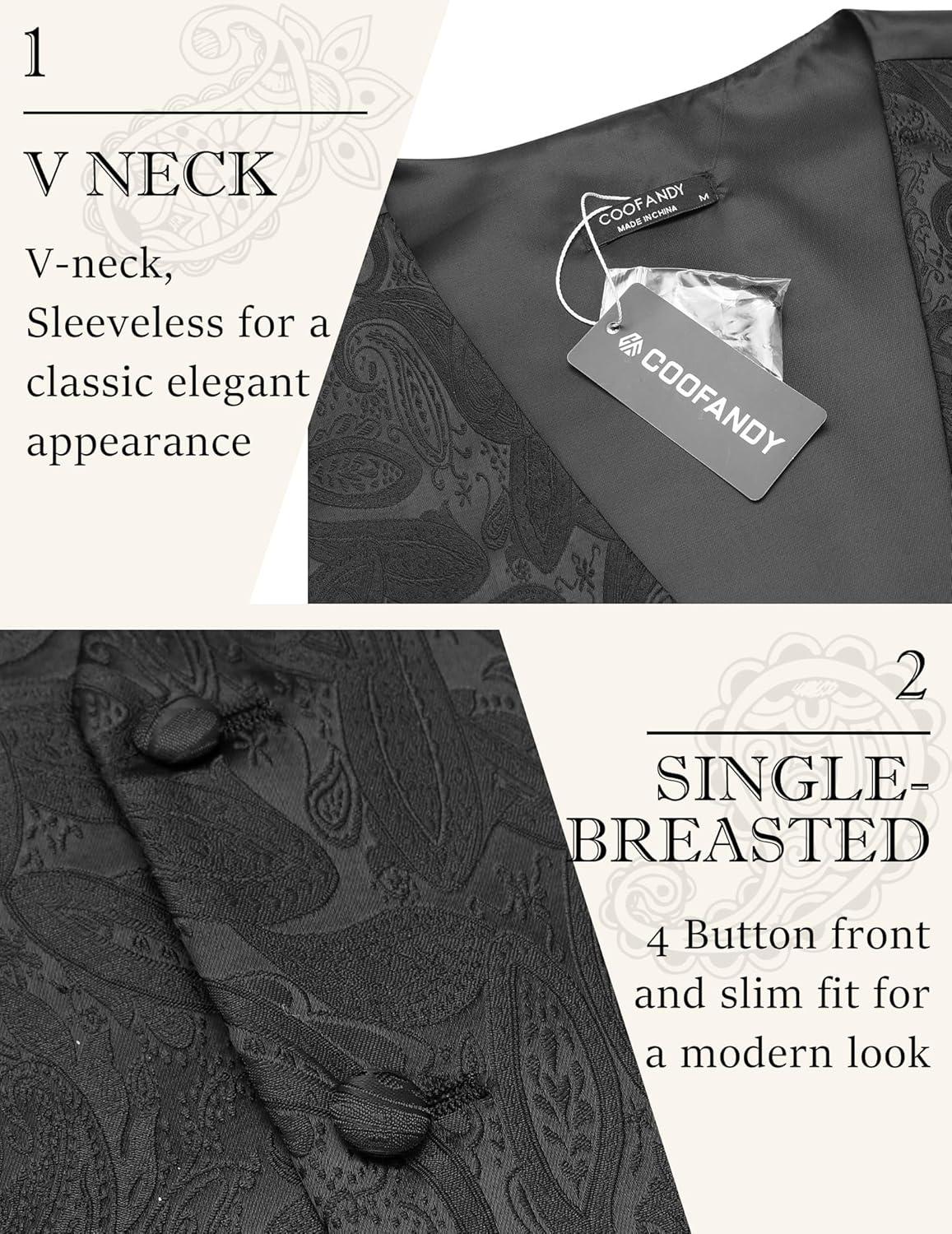 COOFANDY Men's Christmas Vest Tie Set 3PC Paisley Jacquard Waistcoat and Necktie Pocket Square for Holiday Party Wedding(Black)