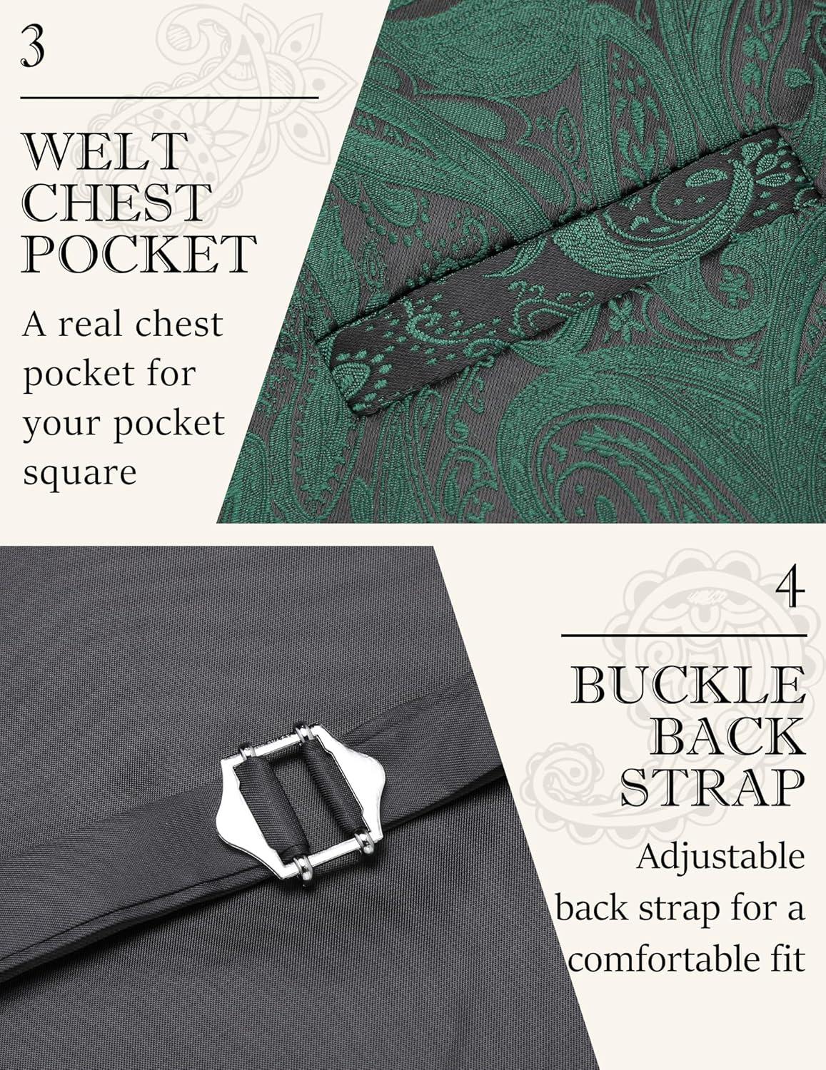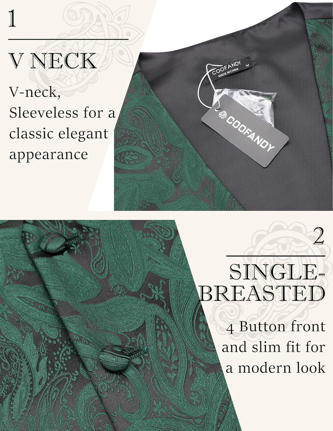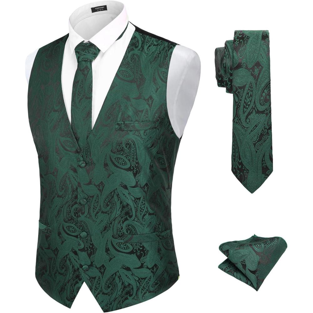 COOFANDY Men's Christmas Vest Tie Set 3PC Paisley Jacquard Waistcoat and Necktie Pocket Square for Holiday Party Wedding(Dark Green)