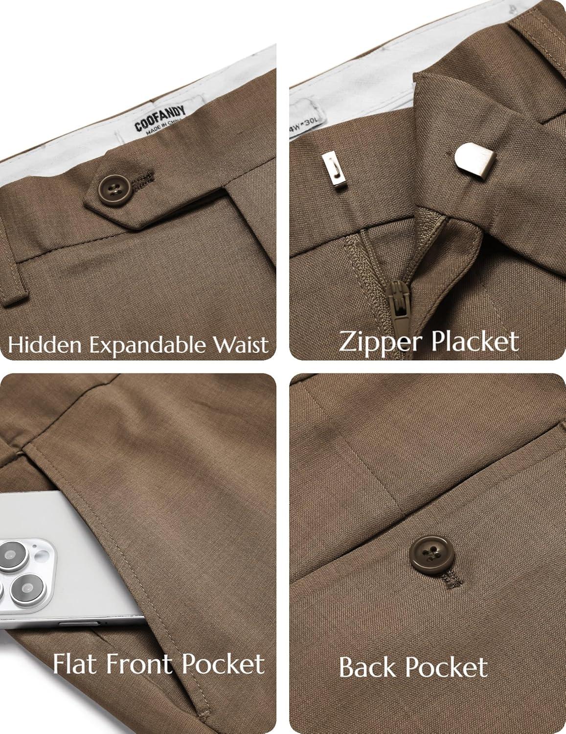 COOFANDY Mens Classic Casual Dress Pants Expandable Waist Suit Pant Slim Fit Flat Front Slacks(Grey Brown)