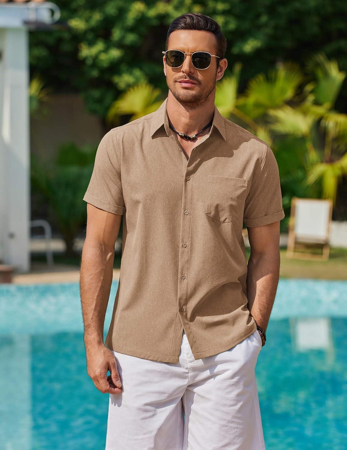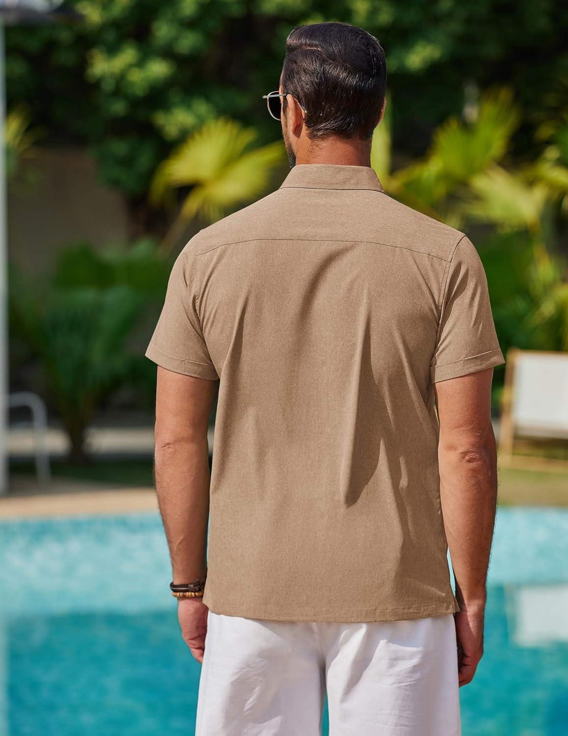 COOFANDY Mens Cool Button Down Shirt Short Sleeve Summer Beach Shirts Linen Texture Casual Shirts with Pocket(Khaki)