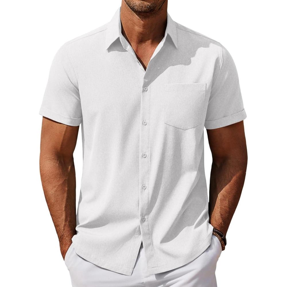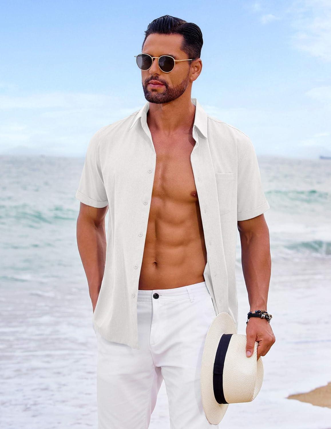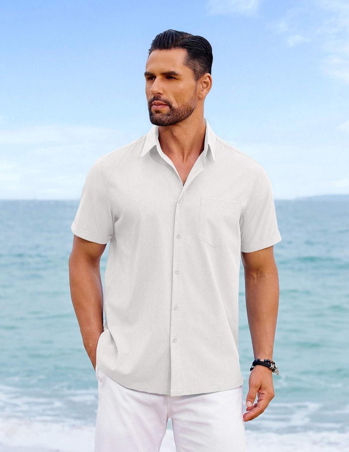 COOFANDY Mens Cool Button Down Shirt Short Sleeve Summer Beach Shirts Linen Texture Casual Shirts with Pocket(White)