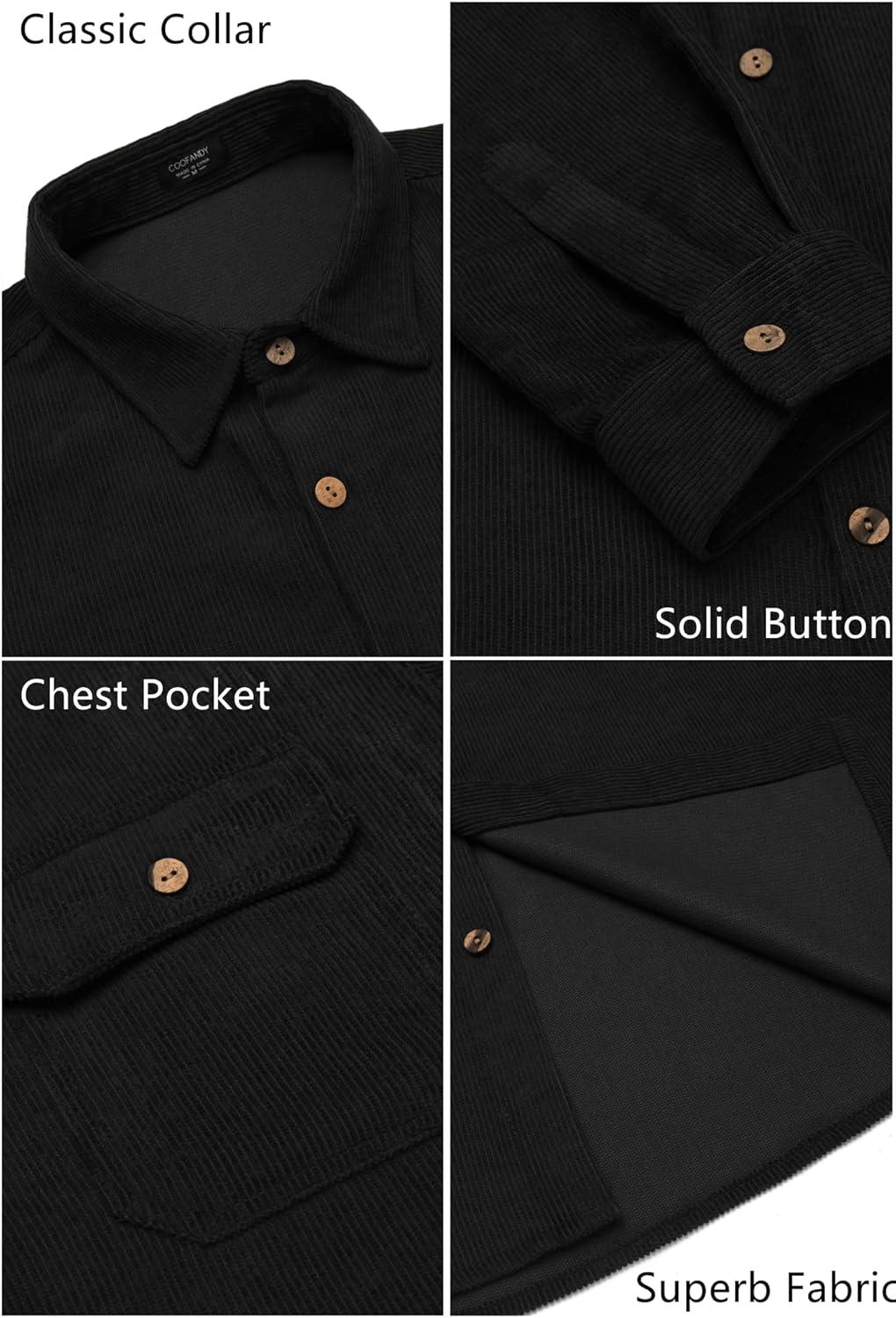 COOFANDY Men's Corduroy Shirt Casual Button Down Shirt Jacket Lightweight Shacket(Black)