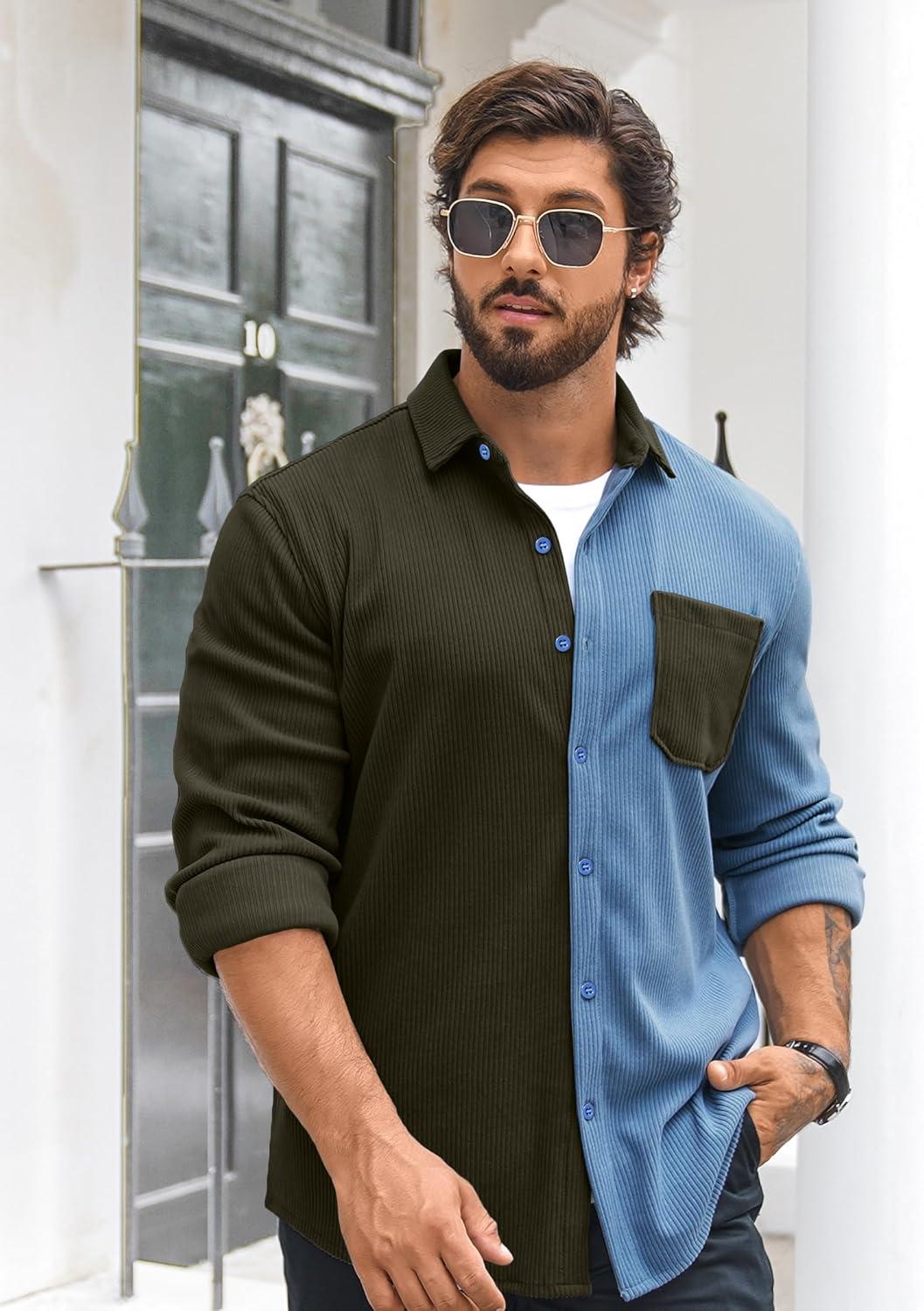 COOFANDY Men’s Corduroy Shirt Casual Shacket Long Sleeve Button Down Lightweight Jacket(Color Block – Green)
