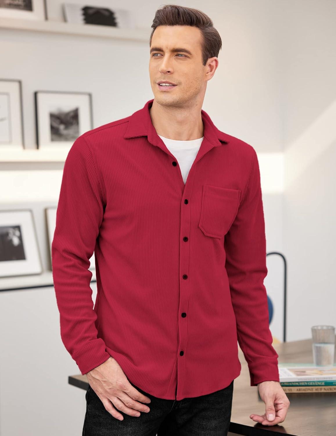 COOFANDY Men’s Corduroy Shirt Casual Shacket Long Sleeve Button Down Lightweight Jacket(Red)