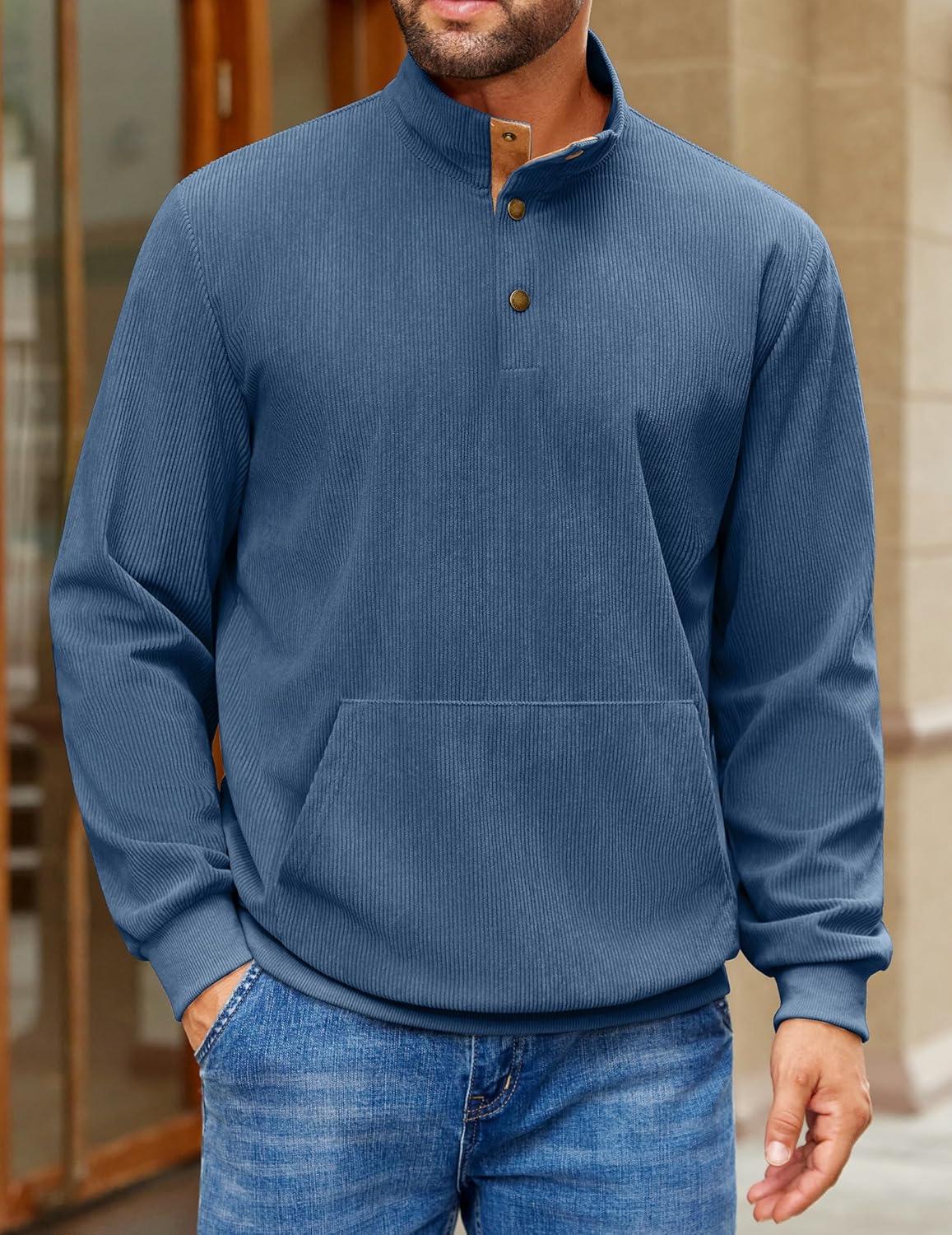 COOFANDY Mens Corduroy Sweatshirt Long Sleeve Pullover Quarter Button Fall Sweat Shirts(Grey Blue)