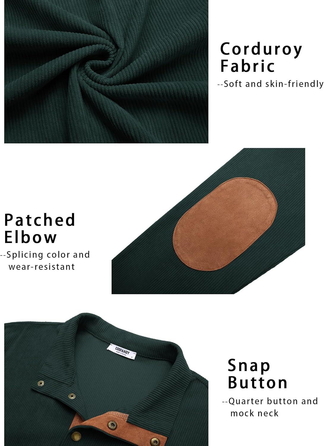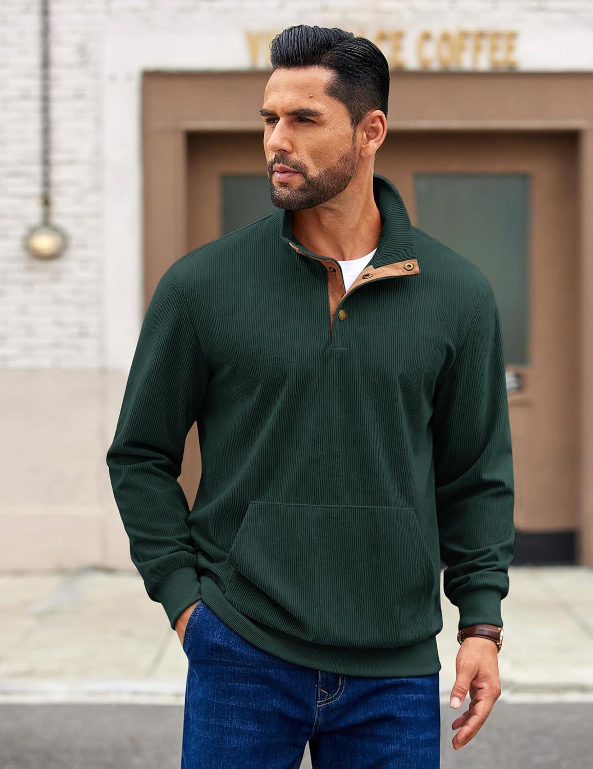 COOFANDY Mens Corduroy Sweatshirt Long Sleeve Pullover Quarter Button Fall Sweat Shirts(Lake Green)