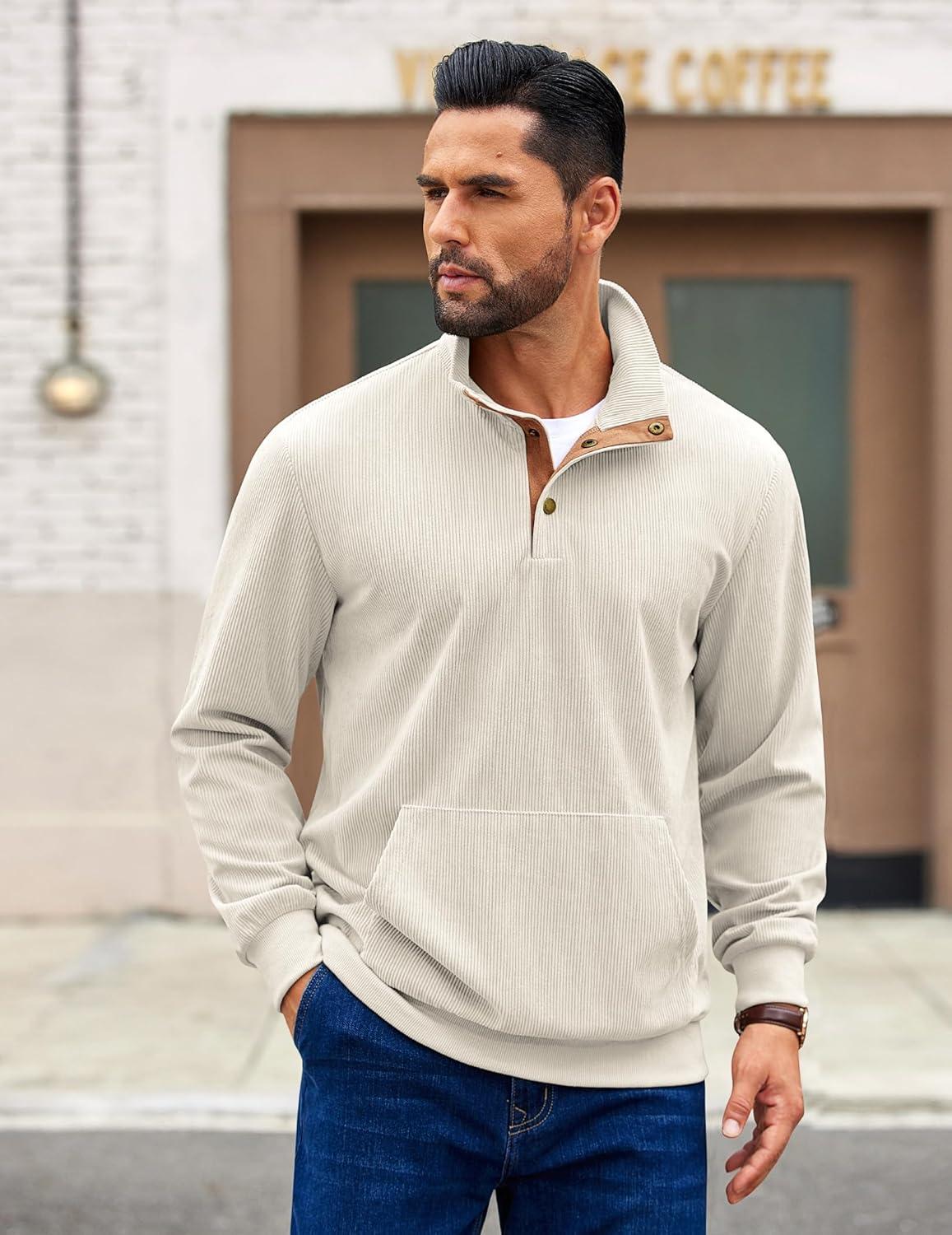 COOFANDY Mens Corduroy Sweatshirt Long Sleeve Pullover Quarter Button Fall Sweat Shirts(Light Khaki)