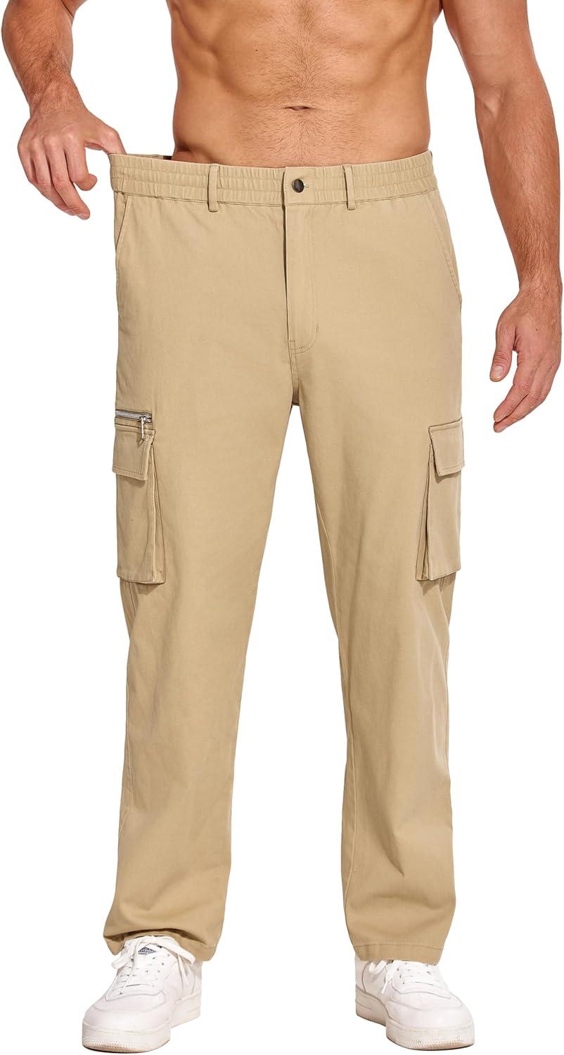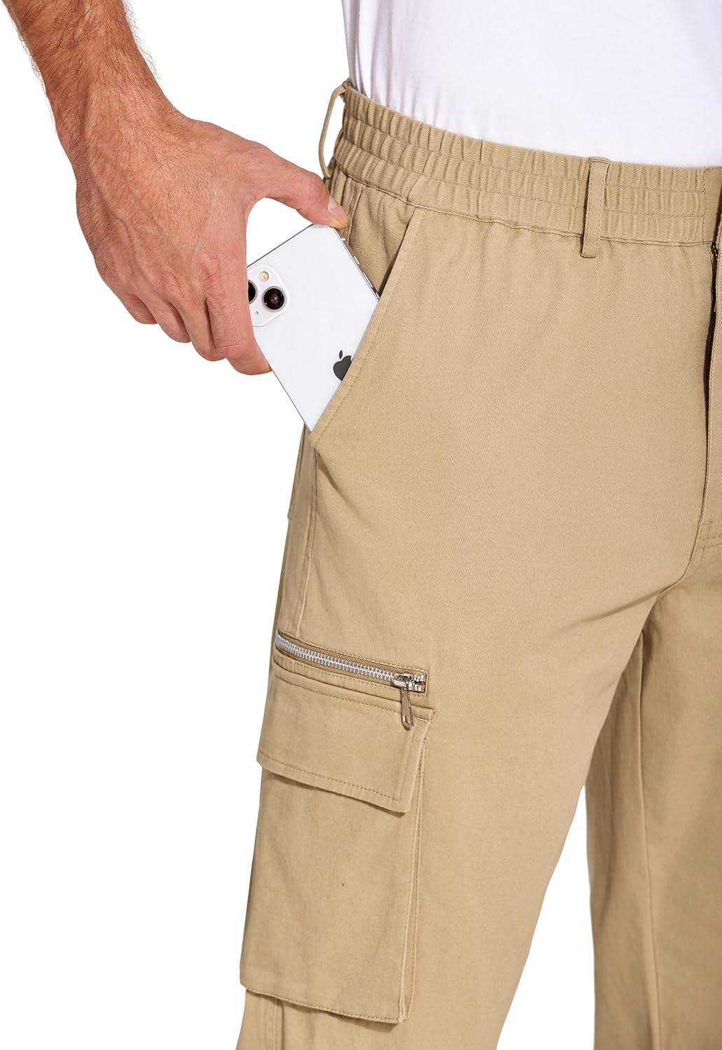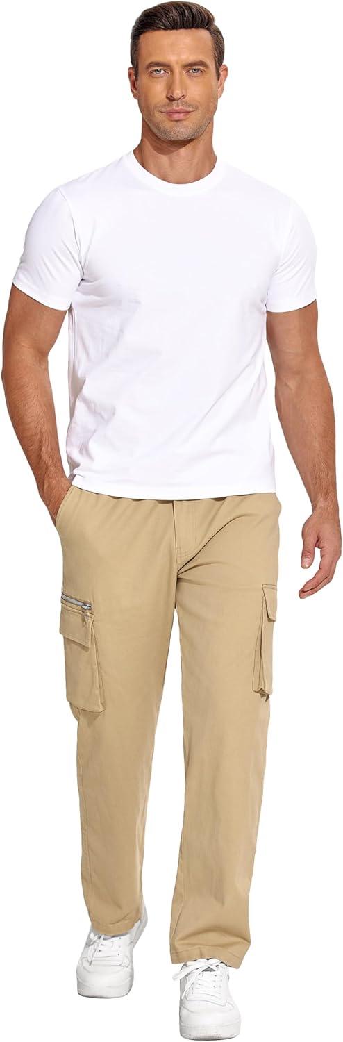 COOFANDY Men's Cotton Cargo Pants Relaxed Fit Elastic Waist Casual Pants Stretch Work Cargo Pant with Pockets(Light Khaki)