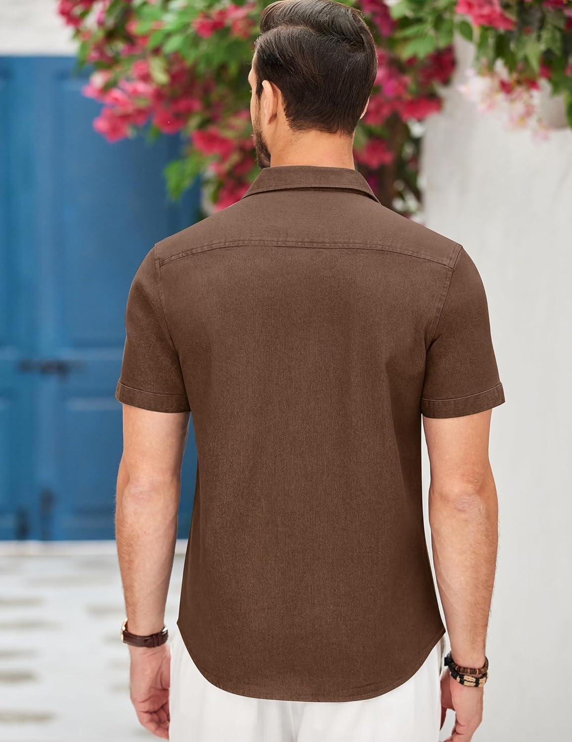COOFANDY Men's Cotton Casual Short Sleeve Button Down Shirt Plaid Collar Denim Work Shirts(A - Brown - No Pocket)