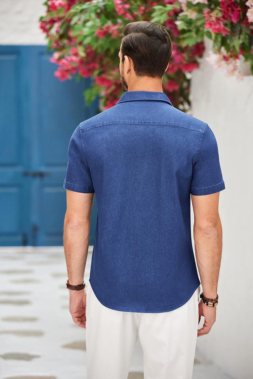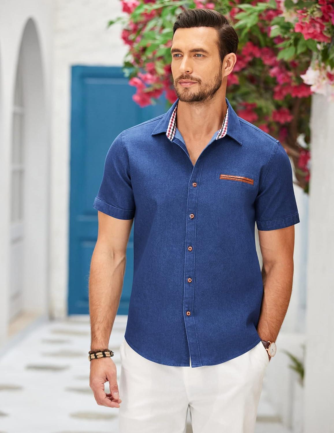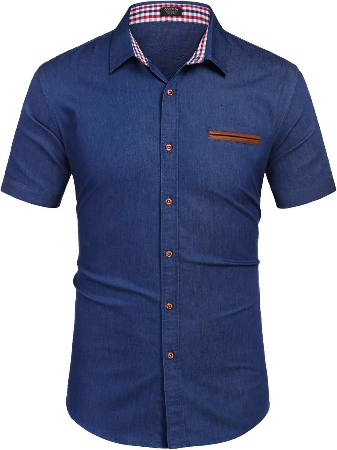 COOFANDY Men’s Cotton Casual Short Sleeve Button Down Shirt Plaid Collar Denim Work Shirts(A – Dark Blue – No Pocket)