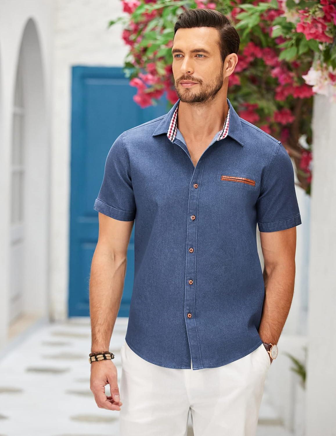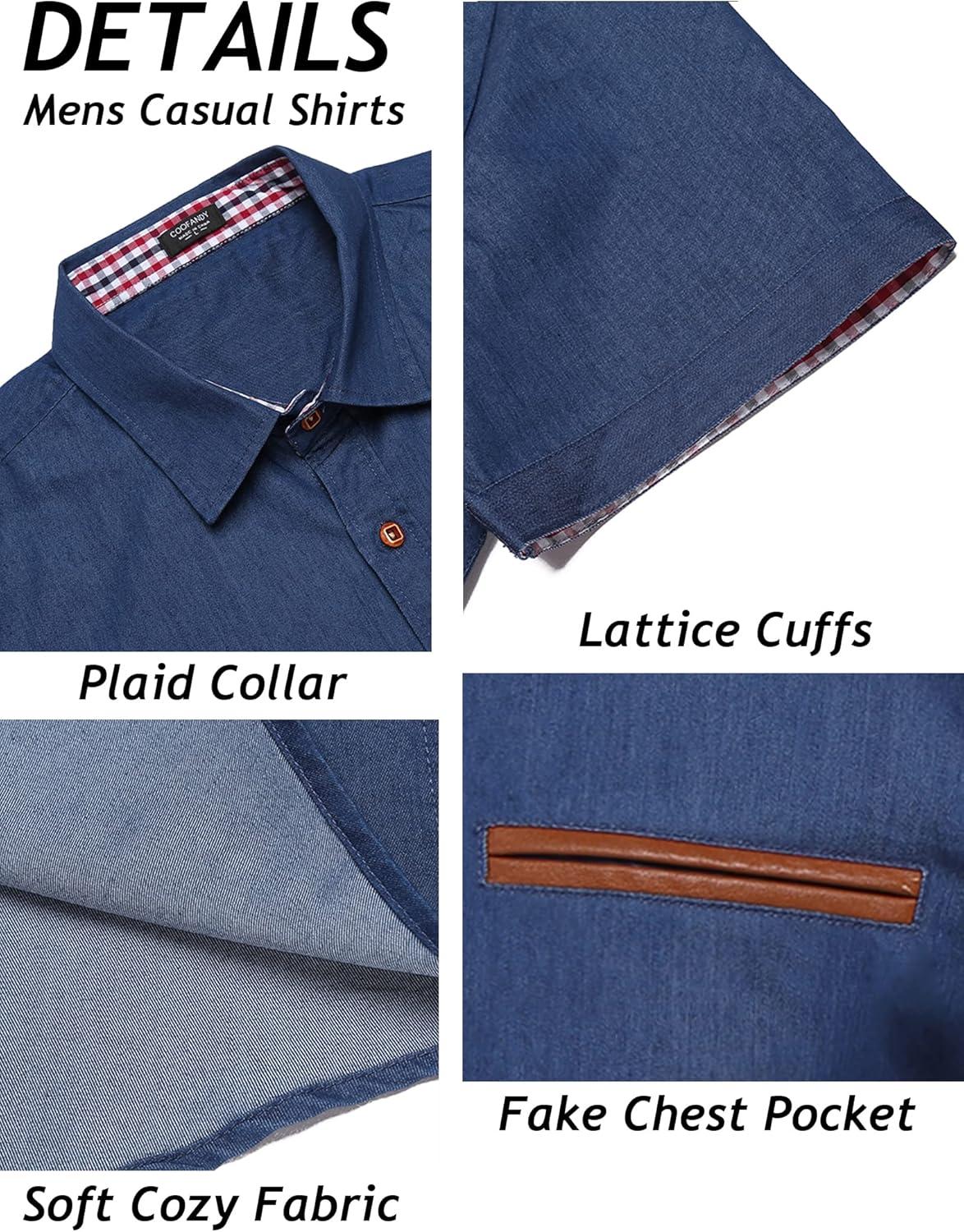 COOFANDY Men’s Cotton Casual Short Sleeve Button Down Shirt Plaid Collar Denim Work Shirts(A – Sky Blue – No Pocket)