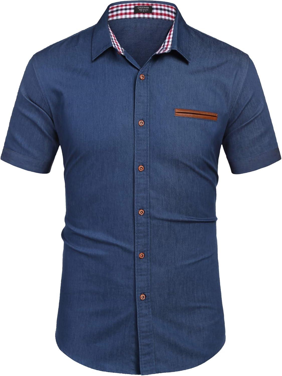 COOFANDY Men's Cotton Casual Short Sleeve Button Down Shirt Plaid Collar Denim Work Shirts(A - Sky Blue - No Pocket)