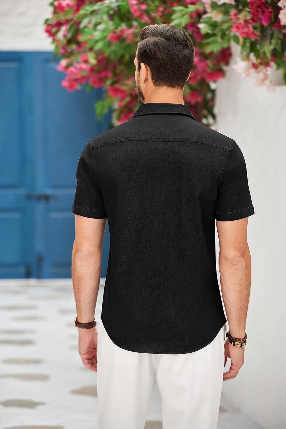 COOFANDY Men's Cotton Casual Short Sleeve Button Down Shirt Plaid Collar Denim Work Shirts(B - Black - No Pocket)
